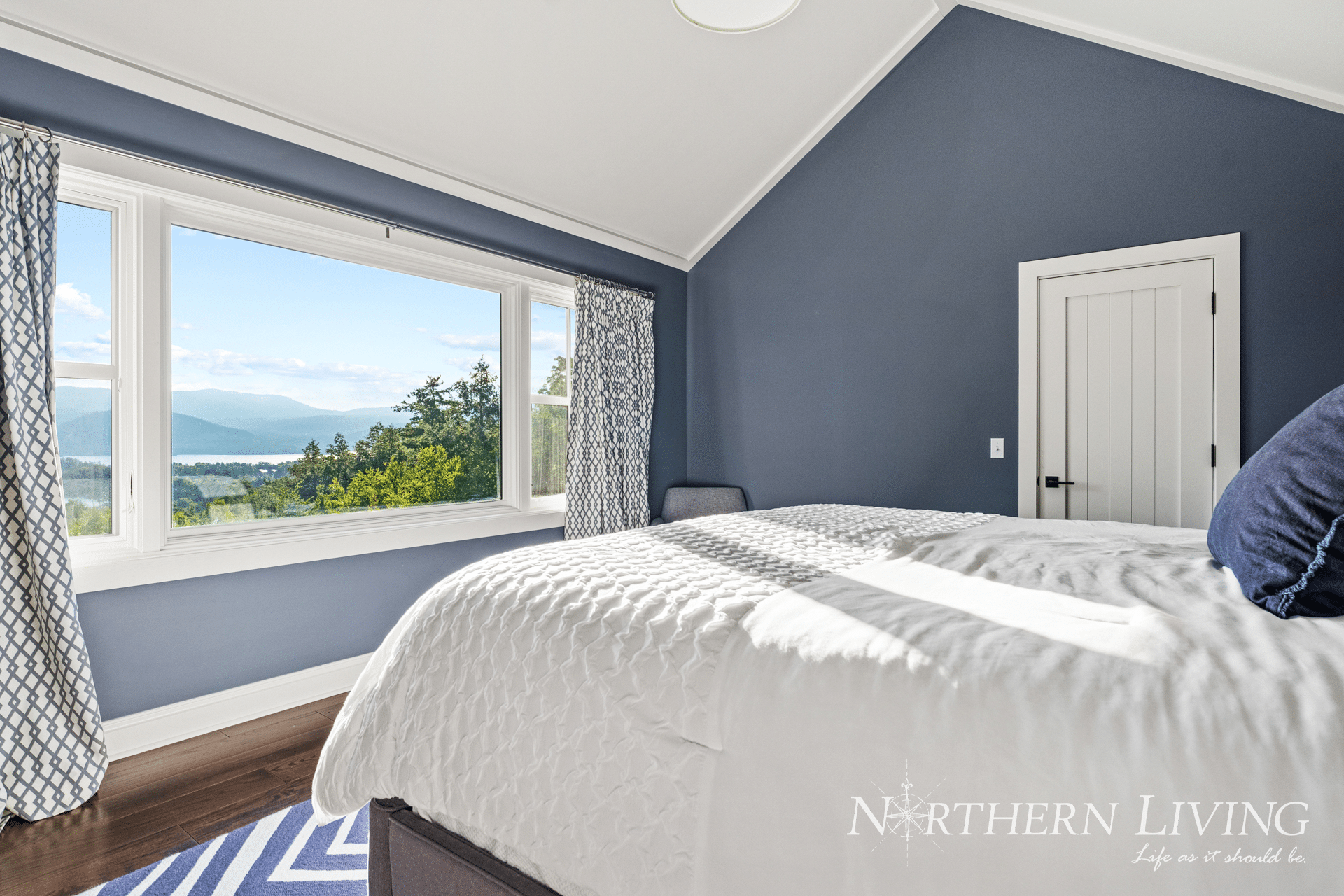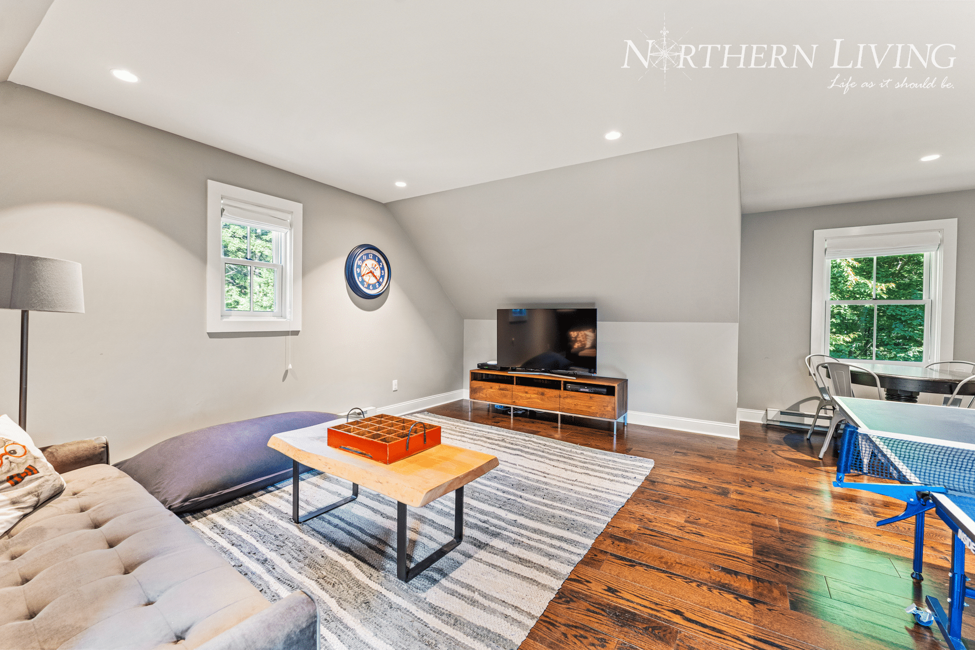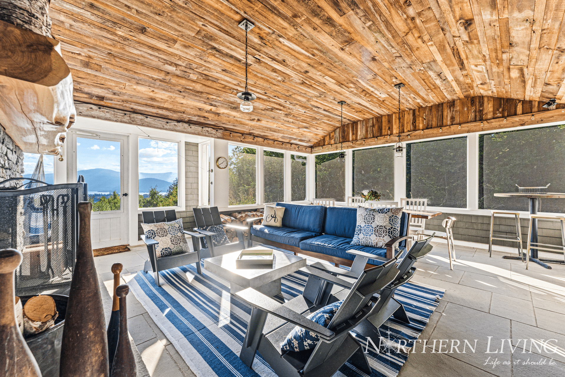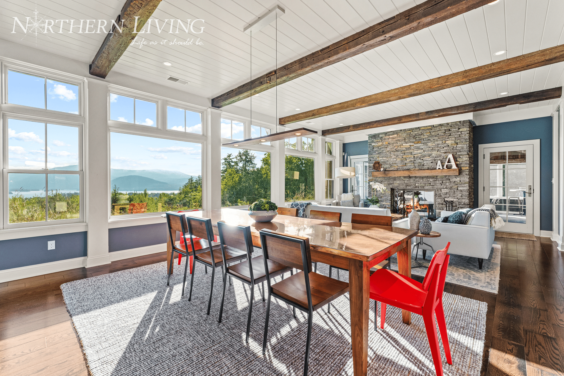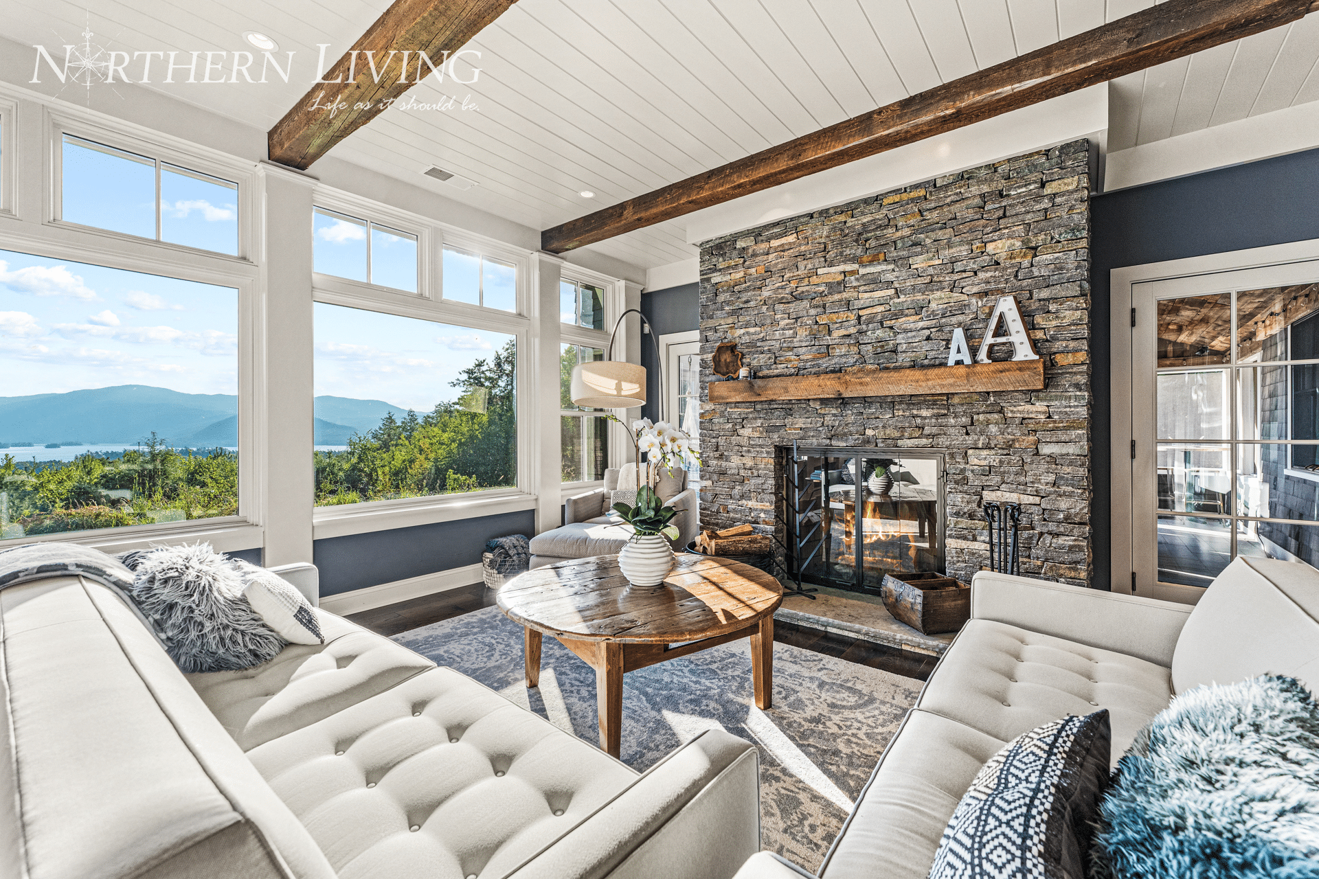 Inside this Bolton Landing vacation home rental you can catch endless lake and mountain views from every room. This home features an open-concept gourmet kitchen with top-of-the-line appliances, dining room, and living room on the main floor. The living room features a beautiful stone fireplace. The main floor also offers a TV room with a pull-out sofa and a full bathroom. Hardwood floors throughout, reclaimed barn wood beams, custom lightning, two stone fireplaces, mudroom with a barn door, are just a few of the architectural features in this pristine home.