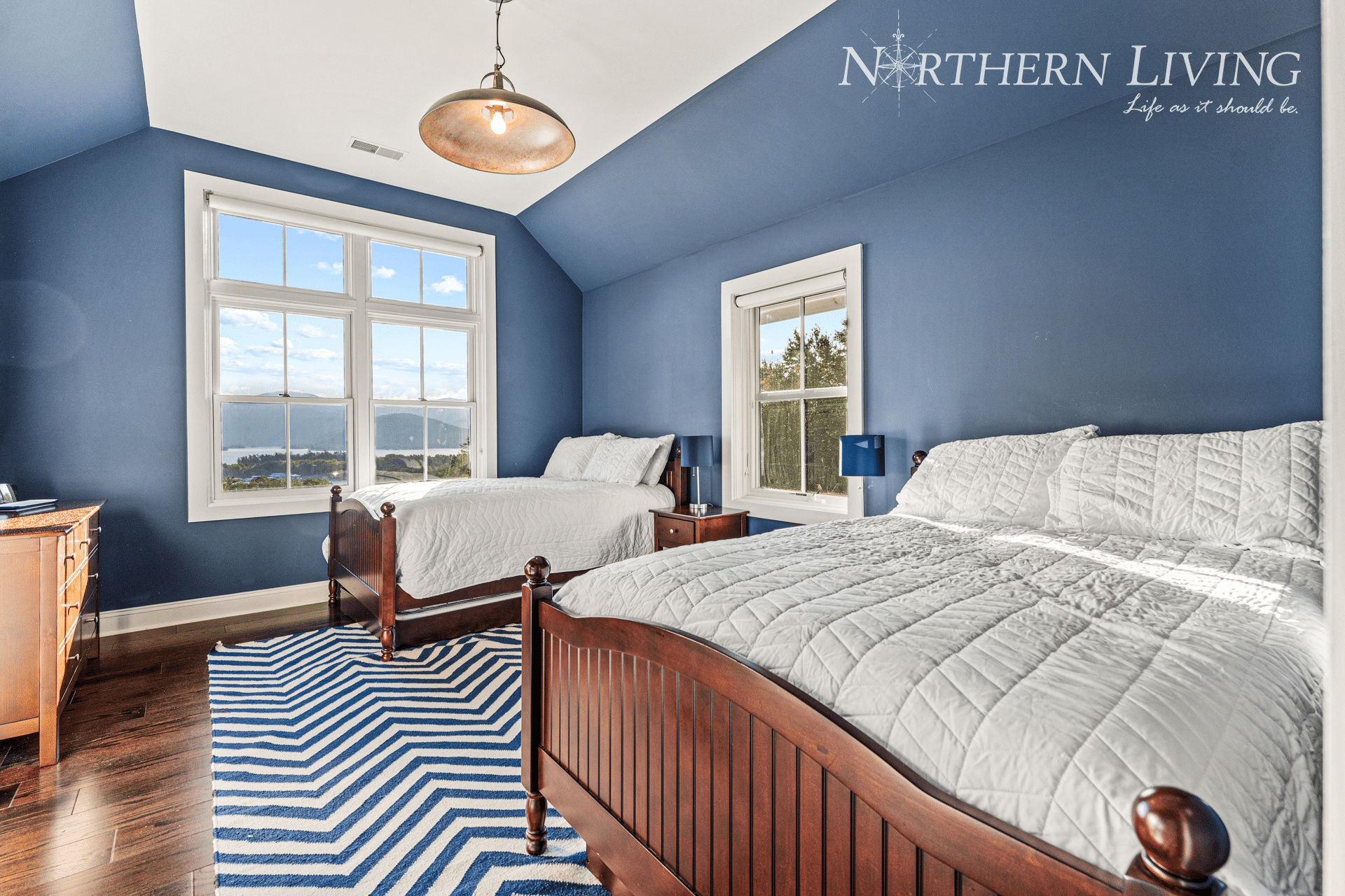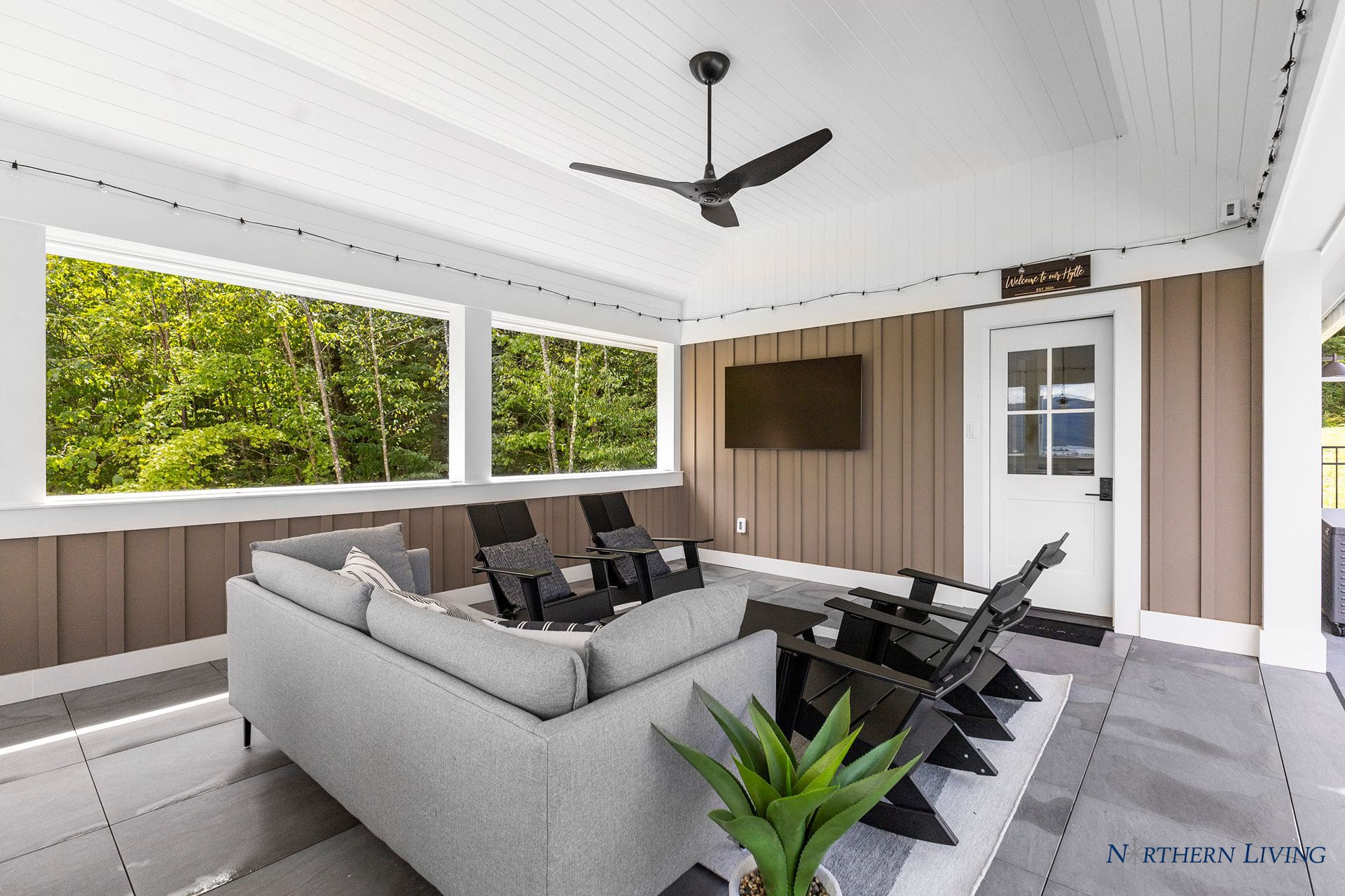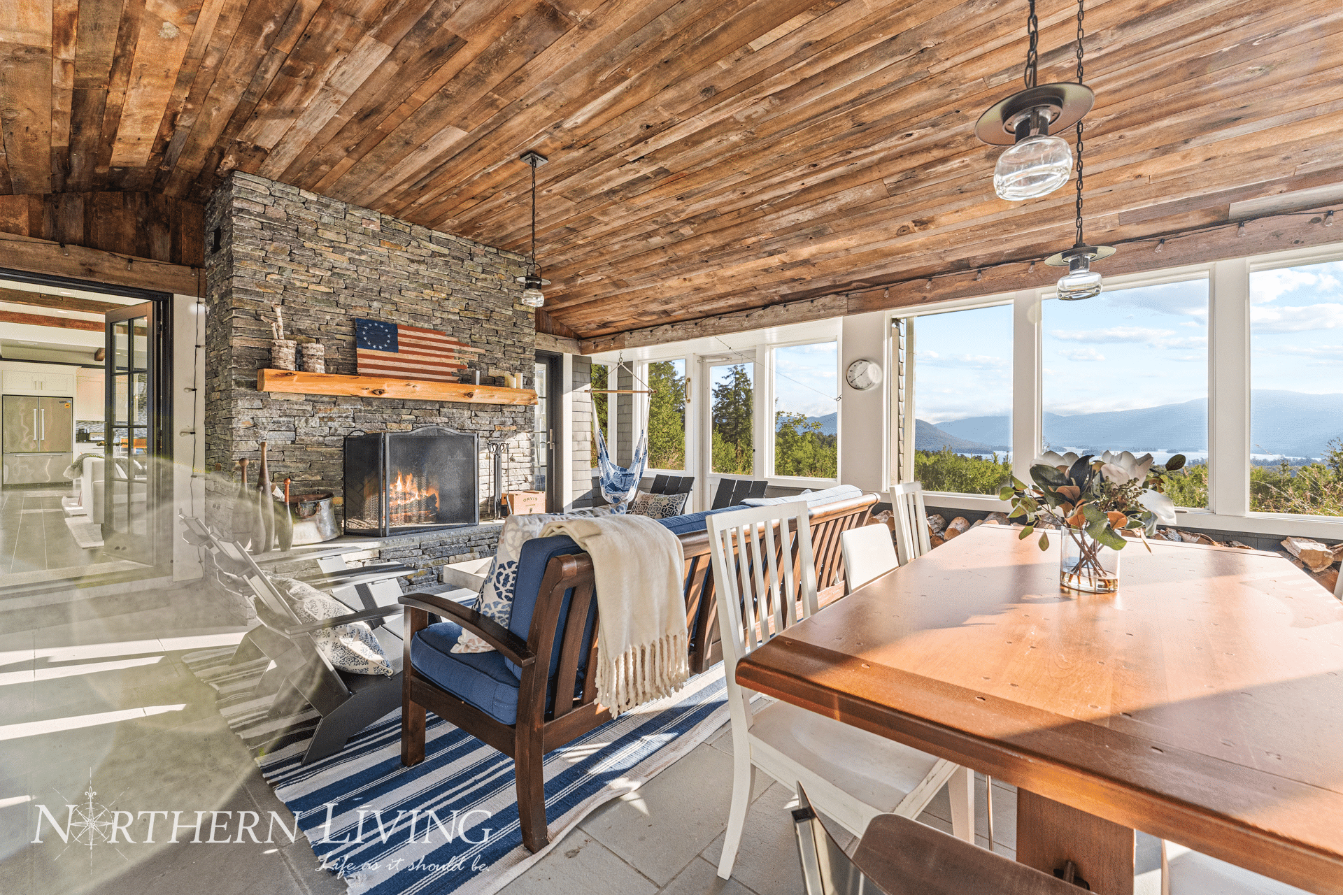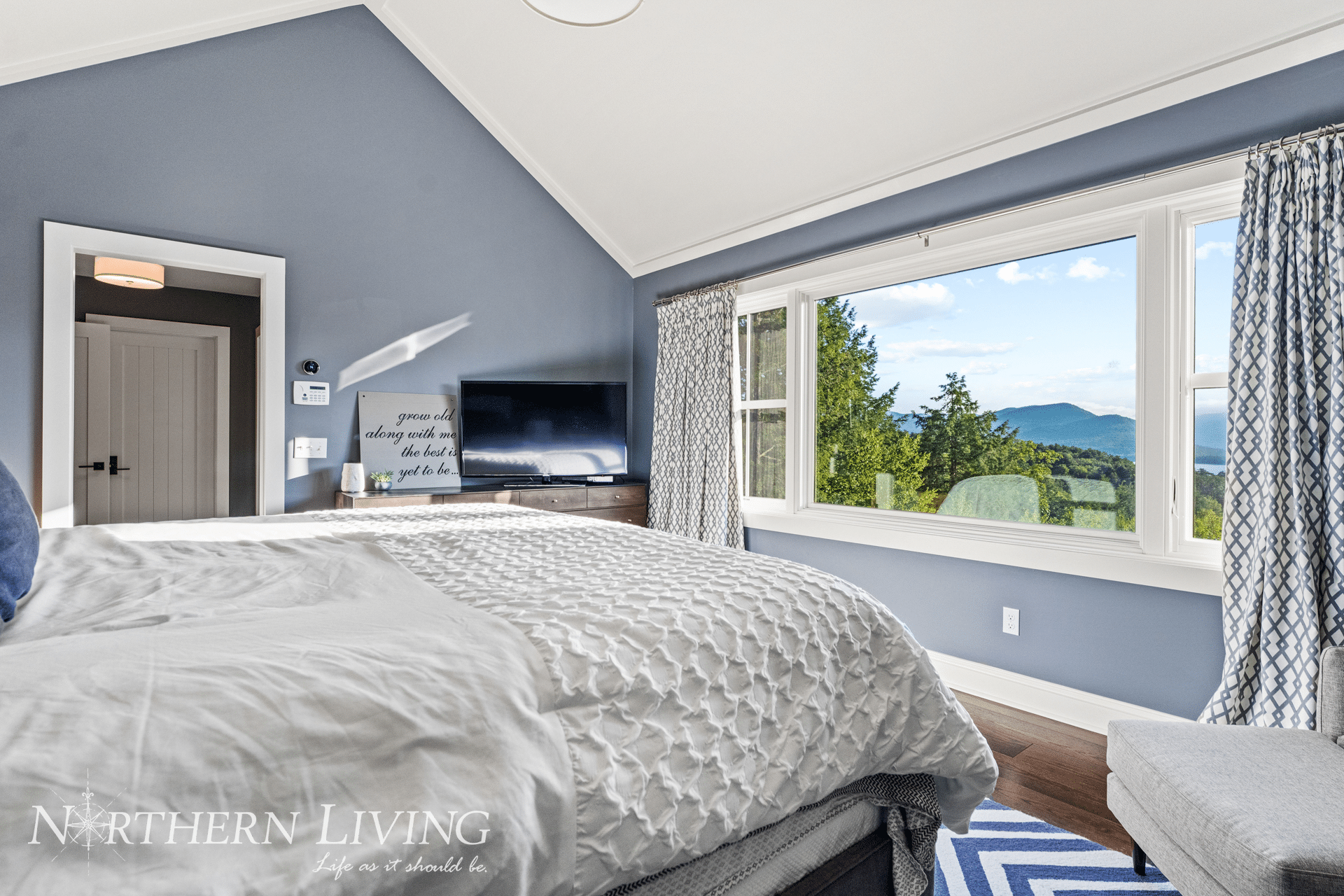 Inside this Bolton Landing vacation home rental you can catch endless lake and mountain views from every room. This home features an open-concept gourmet kitchen with top-of-the-line appliances, dining room, and living room on the main floor. The living room features a beautiful stone fireplace. The main floor also offers a TV room with a pull-out sofa and a full bathroom. Hardwood floors throughout, reclaimed barn wood beams, custom lightning, two stone fireplaces, mudroom with a barn door, are just a few of the architectural features in this pristine home.