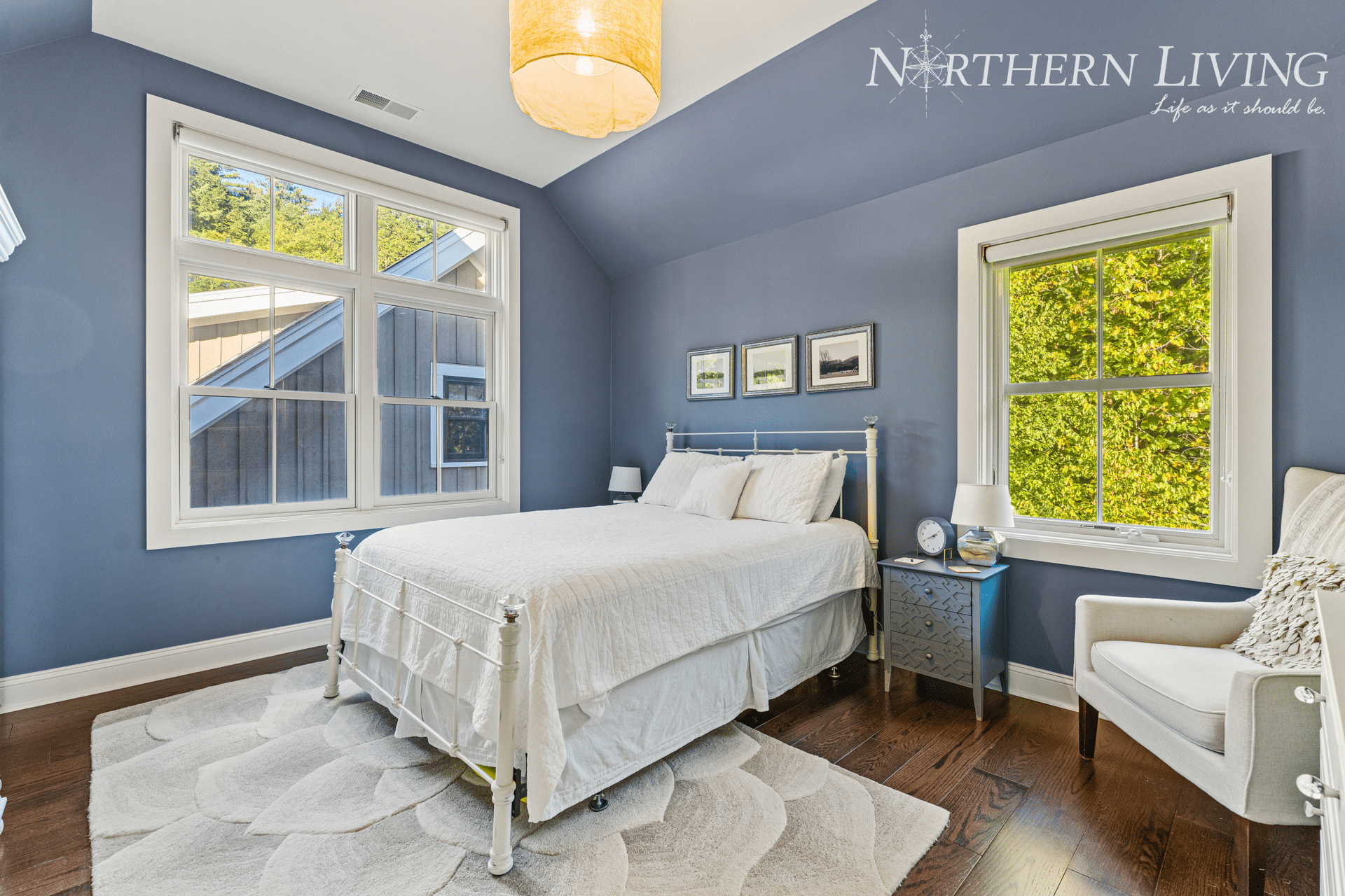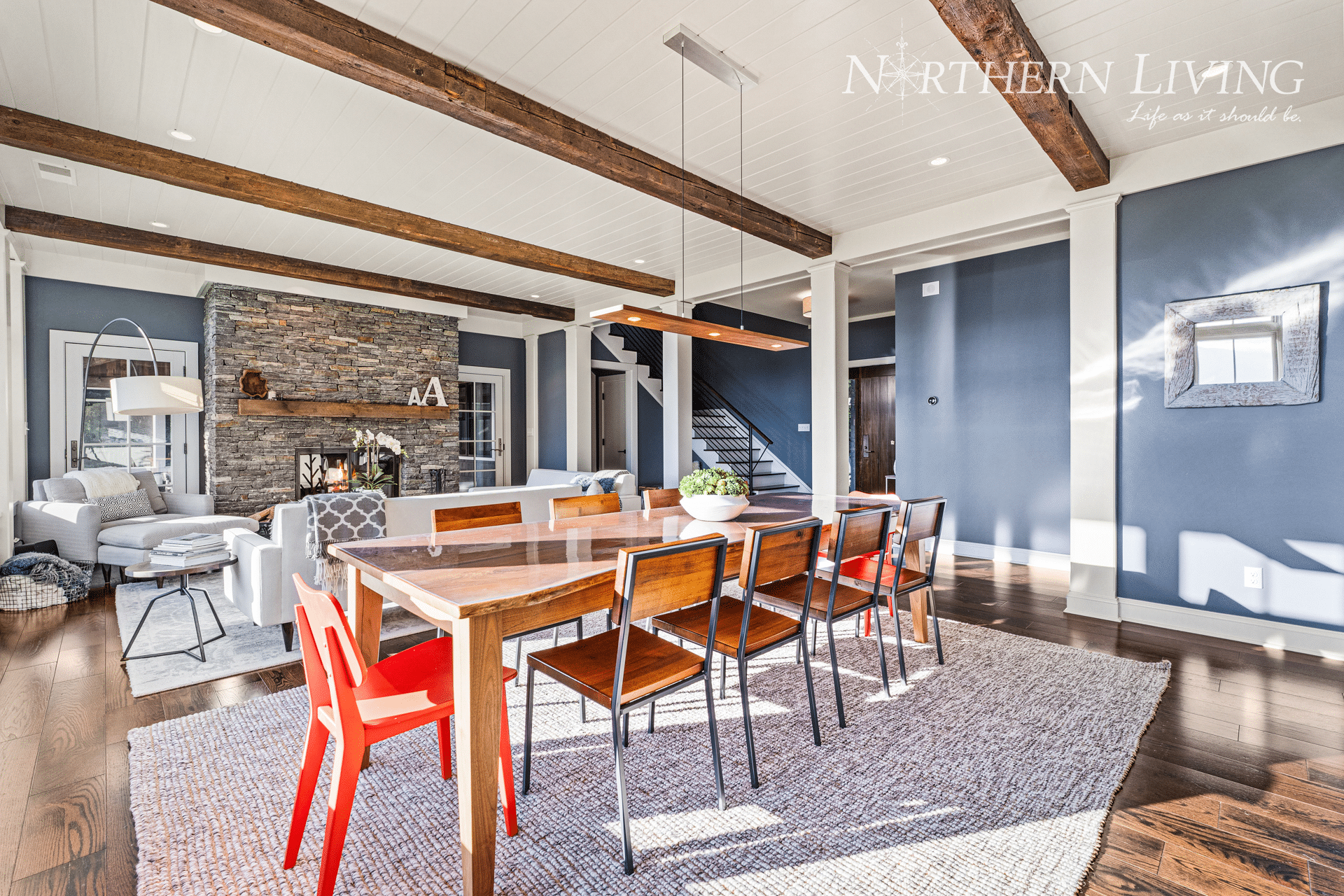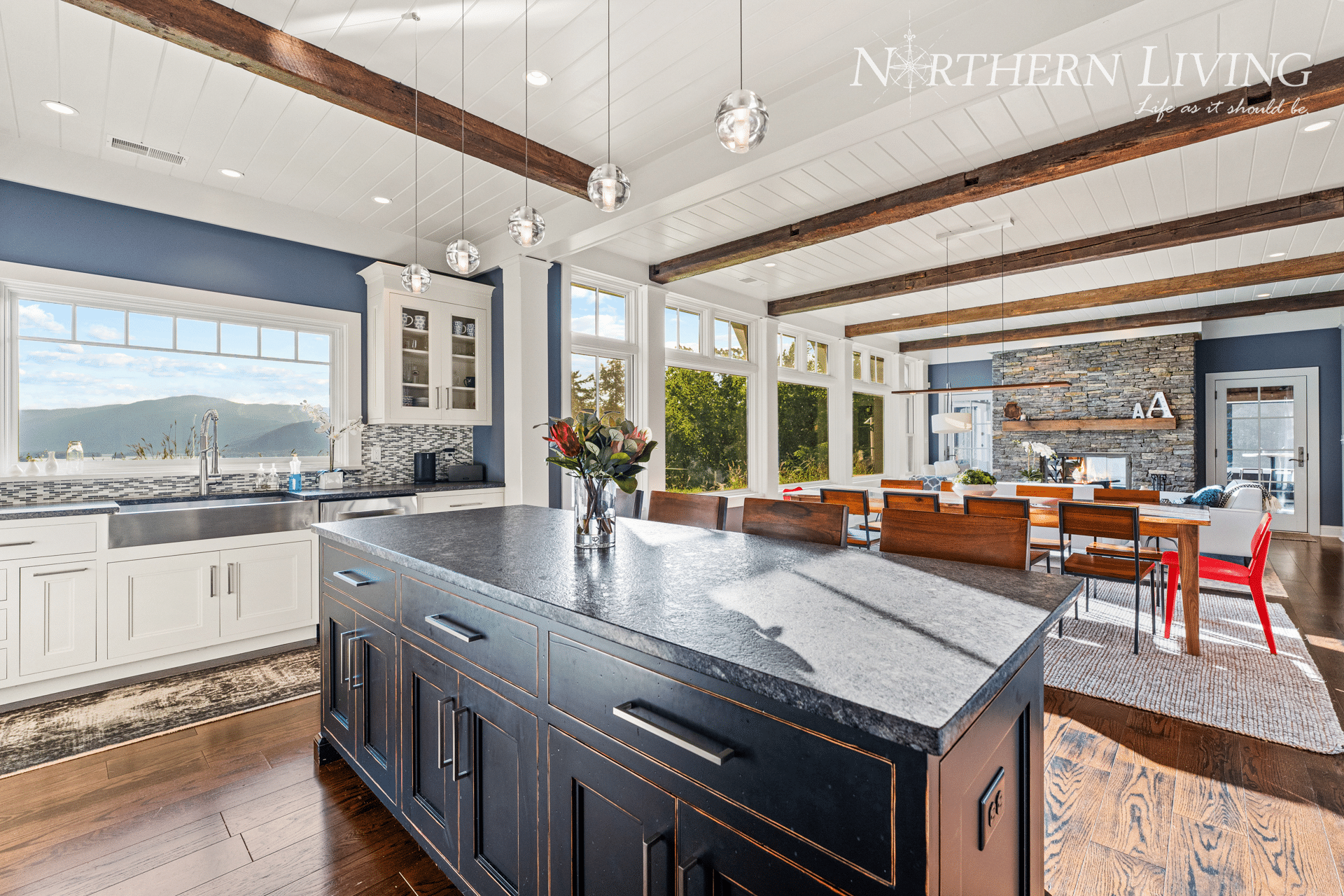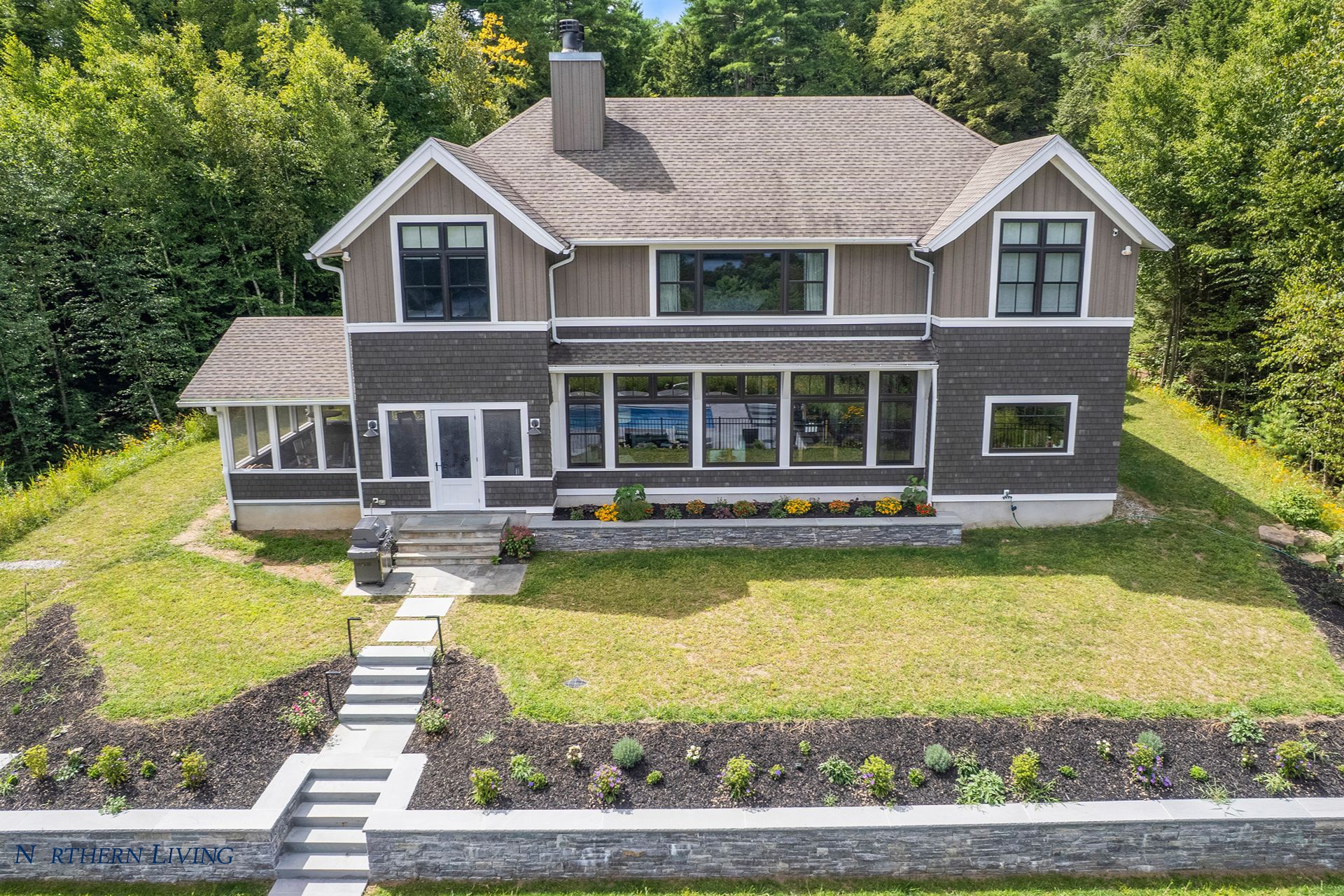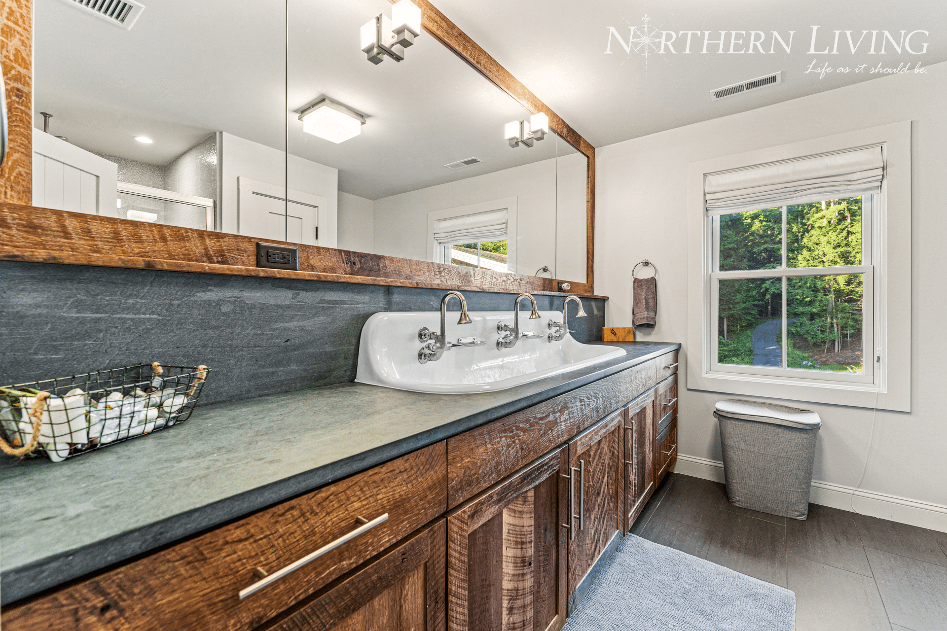 Inside this Bolton Landing vacation home rental you can catch endless lake and mountain views from every room. This home features an open-concept gourmet kitchen with top-of-the-line appliances, dining room, and living room on the main floor. The living room features a beautiful stone fireplace. The main floor also offers a TV room with a pull-out sofa and a full bathroom. Hardwood floors throughout, reclaimed barn wood beams, custom lightning, two stone fireplaces, mudroom with a barn door, are just a few of the architectural features in this pristine home.