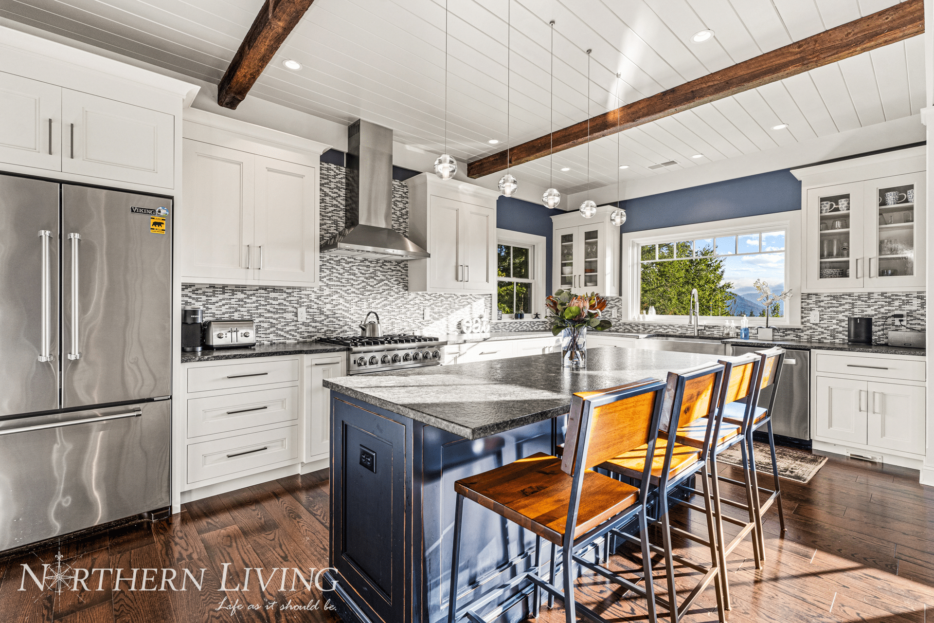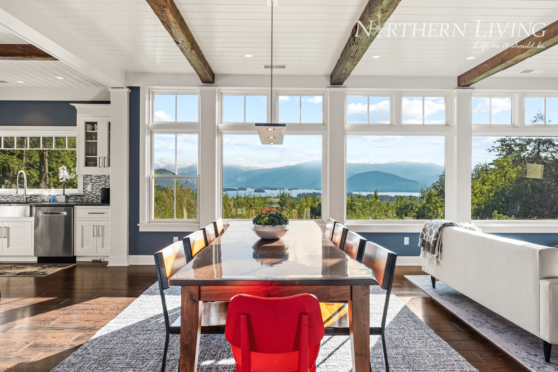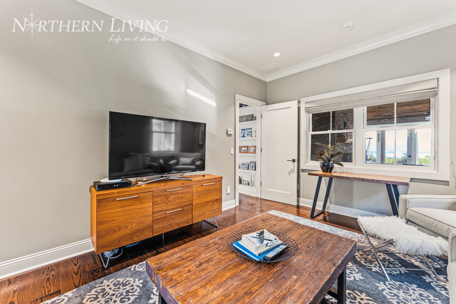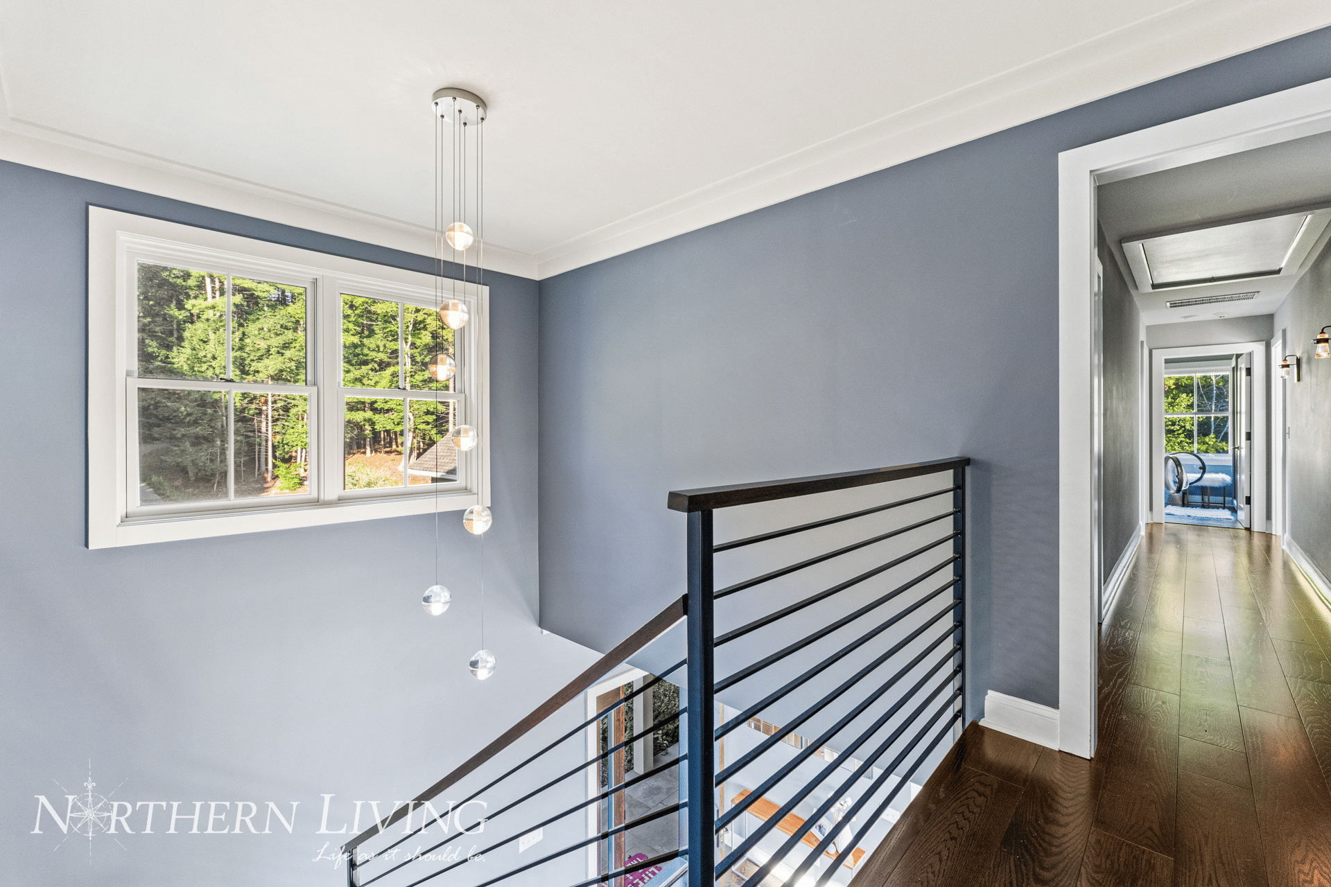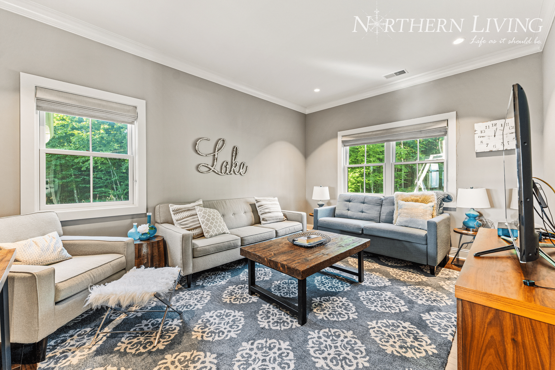 Inside this Bolton Landing vacation home rental you can catch endless lake and mountain views from every room. This home features an open-concept gourmet kitchen with top-of-the-line appliances, dining room, and living room on the main floor. The living room features a beautiful stone fireplace. The main floor also offers a TV room with a pull-out sofa and a full bathroom. Hardwood floors throughout, reclaimed barn wood beams, custom lightning, two stone fireplaces, mudroom with a barn door, are just a few of the architectural features in this pristine home.