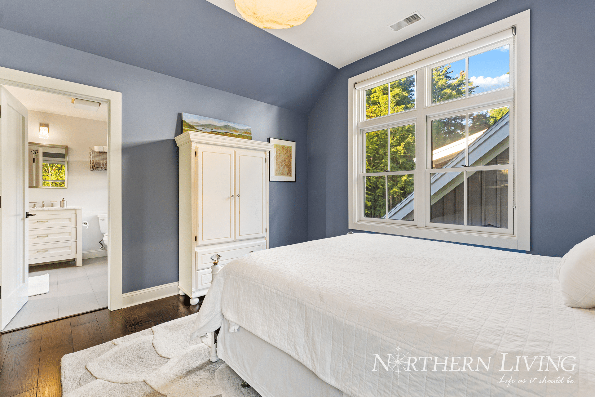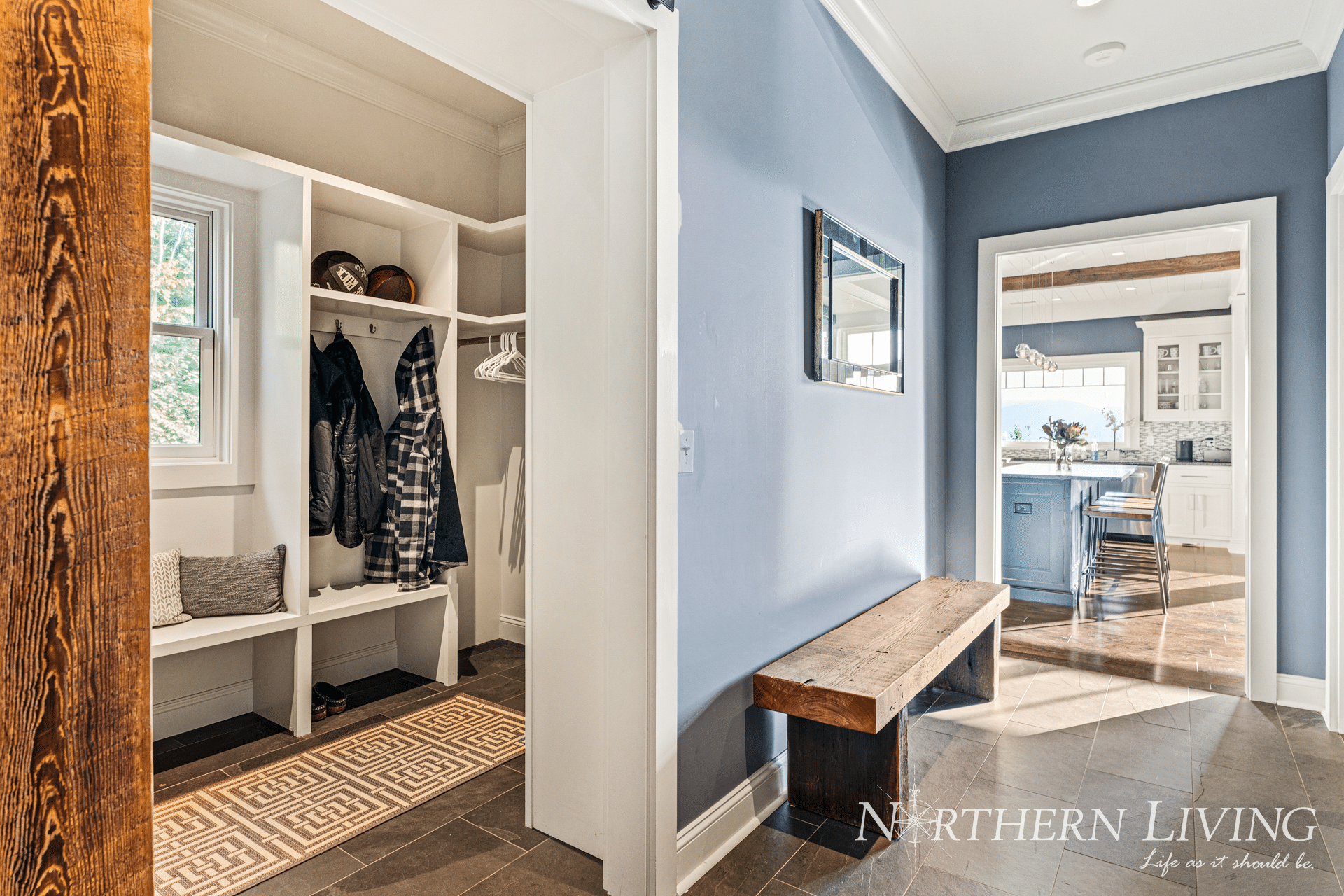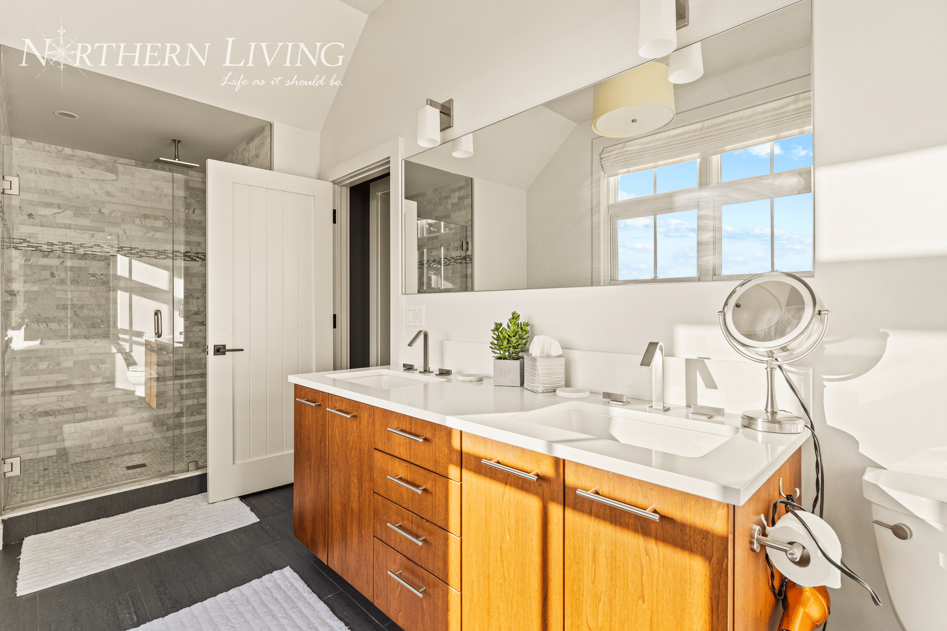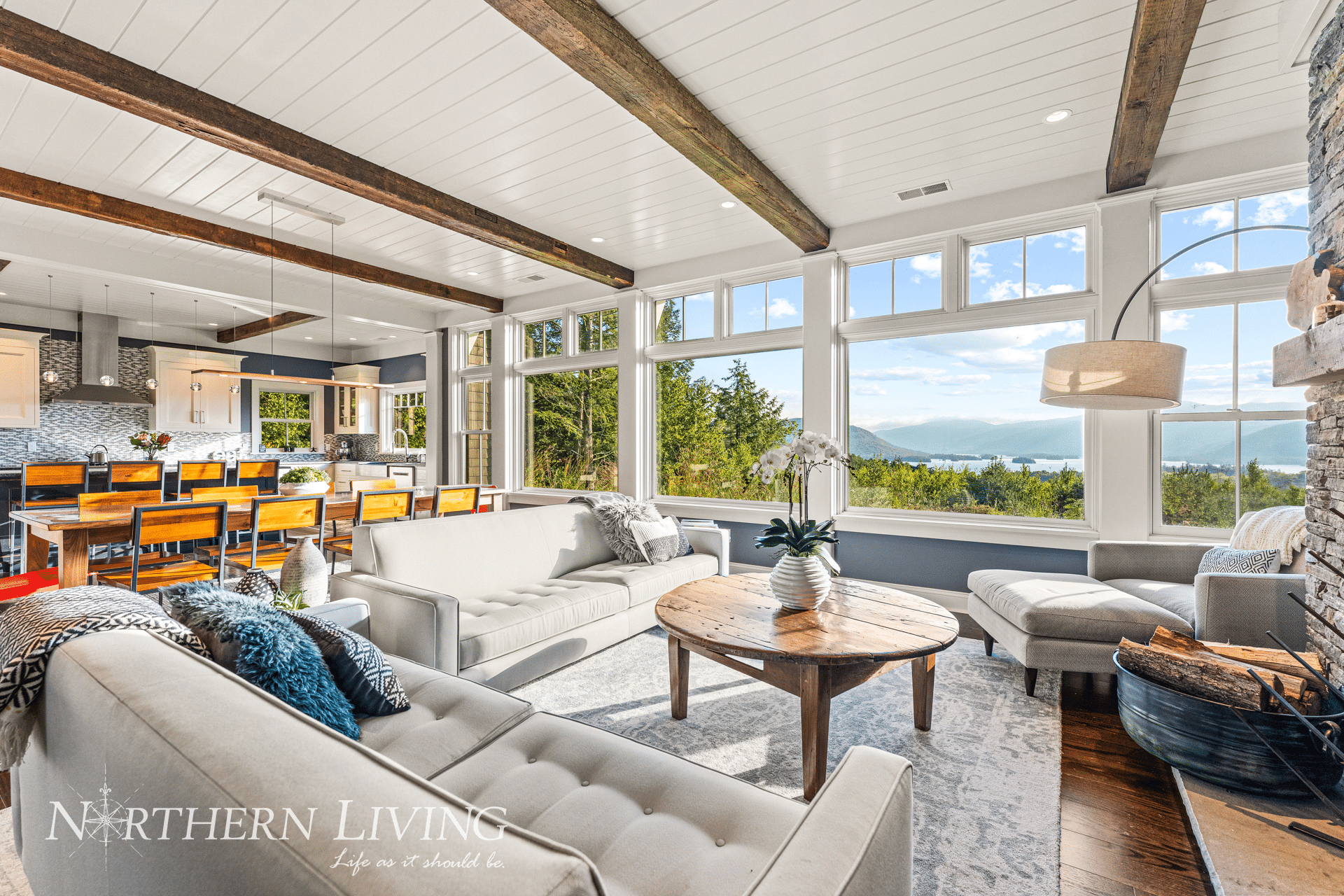 Inside this Bolton Landing vacation home rental you can catch endless lake and mountain views from every room. This home features an open-concept gourmet kitchen with top-of-the-line appliances, dining room, and living room on the main floor. The living room features a beautiful stone fireplace. The main floor also offers a TV room with a pull-out sofa and a full bathroom. Hardwood floors throughout, reclaimed barn wood beams, custom lightning, two stone fireplaces, mudroom with a barn door, are just a few of the architectural features in this pristine home.