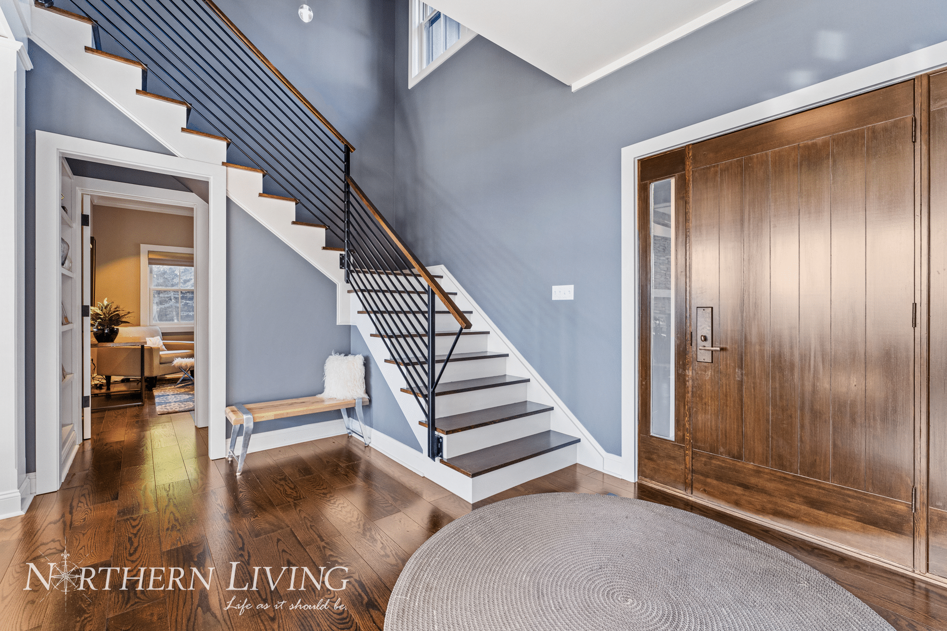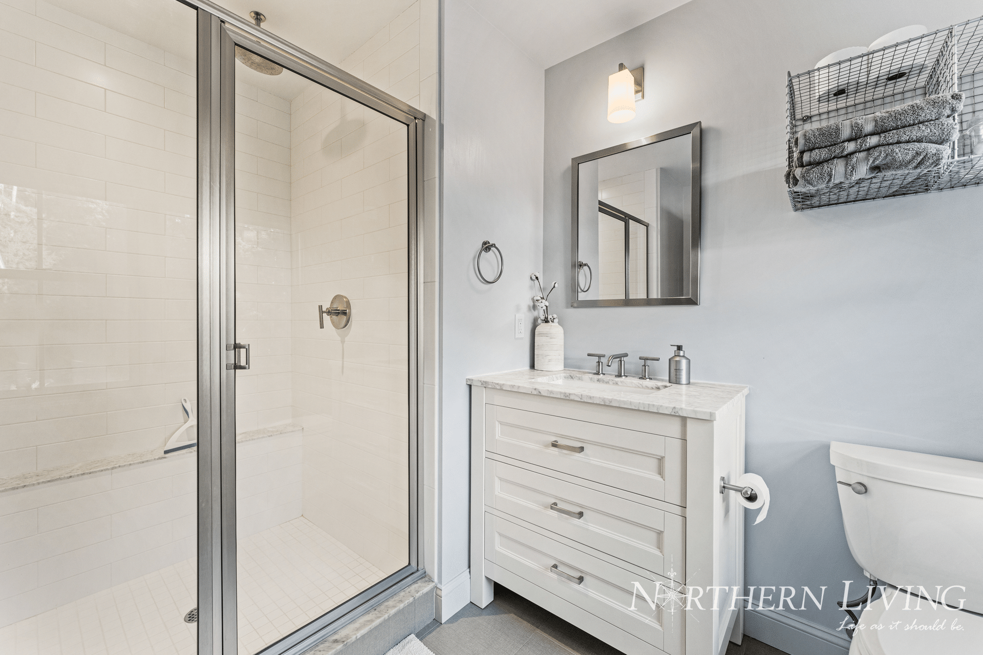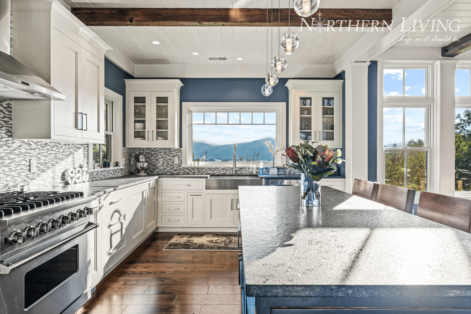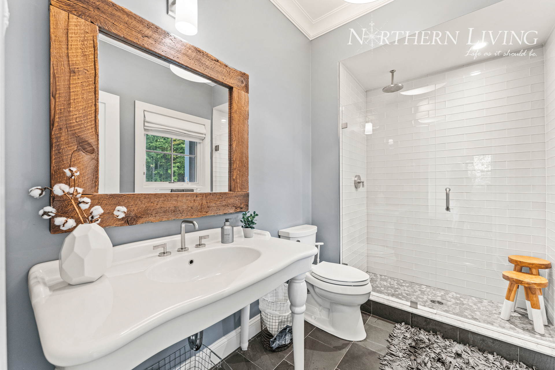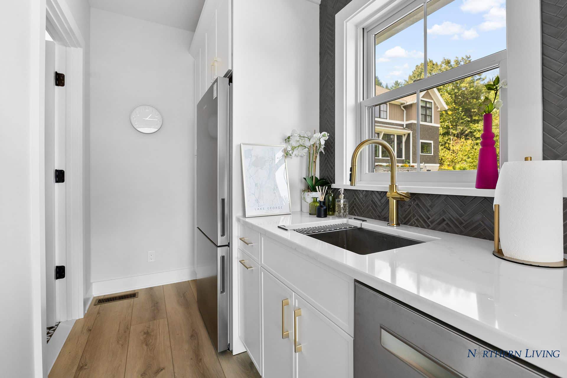 Inside this Bolton Landing vacation home rental you can catch endless lake and mountain views from every room. This home features an open-concept gourmet kitchen with top-of-the-line appliances, dining room, and living room on the main floor. The living room features a beautiful stone fireplace. The main floor also offers a TV room with a pull-out sofa and a full bathroom. Hardwood floors throughout, reclaimed barn wood beams, custom lightning, two stone fireplaces, mudroom with a barn door, are just a few of the architectural features in this pristine home.