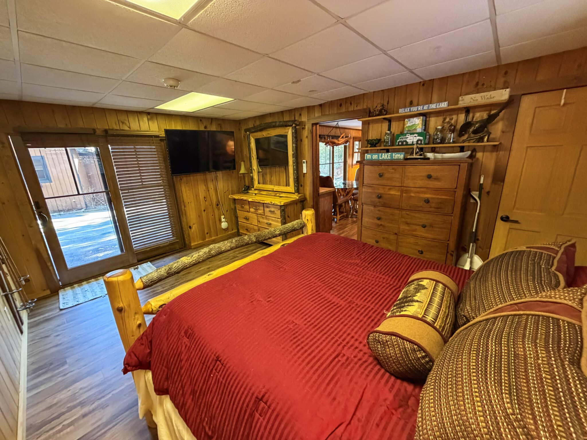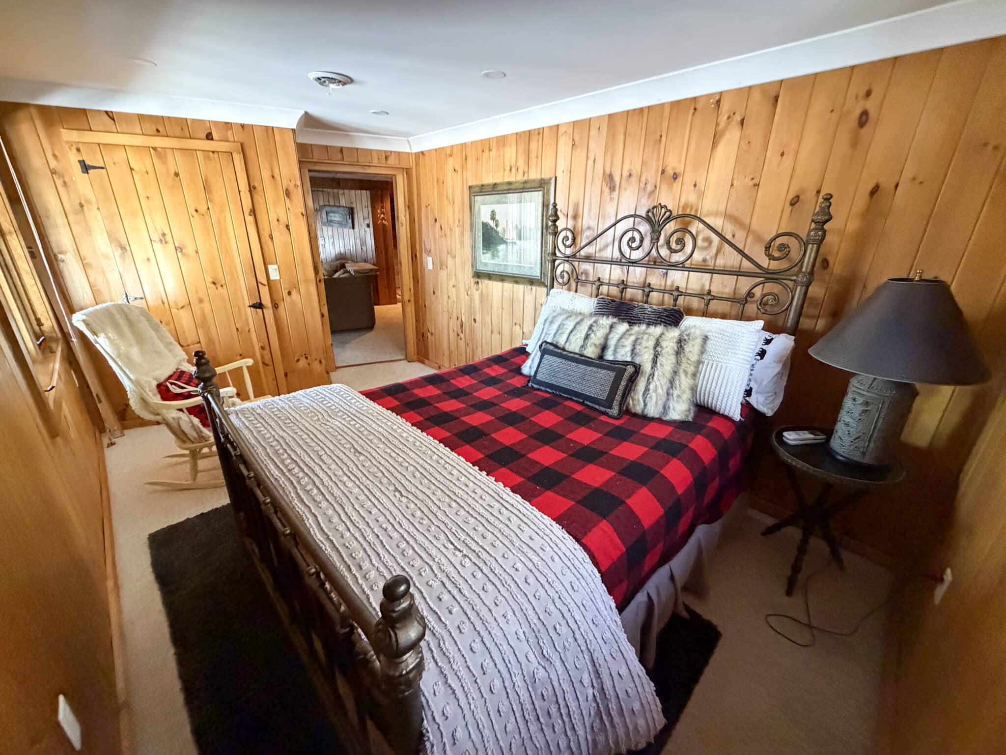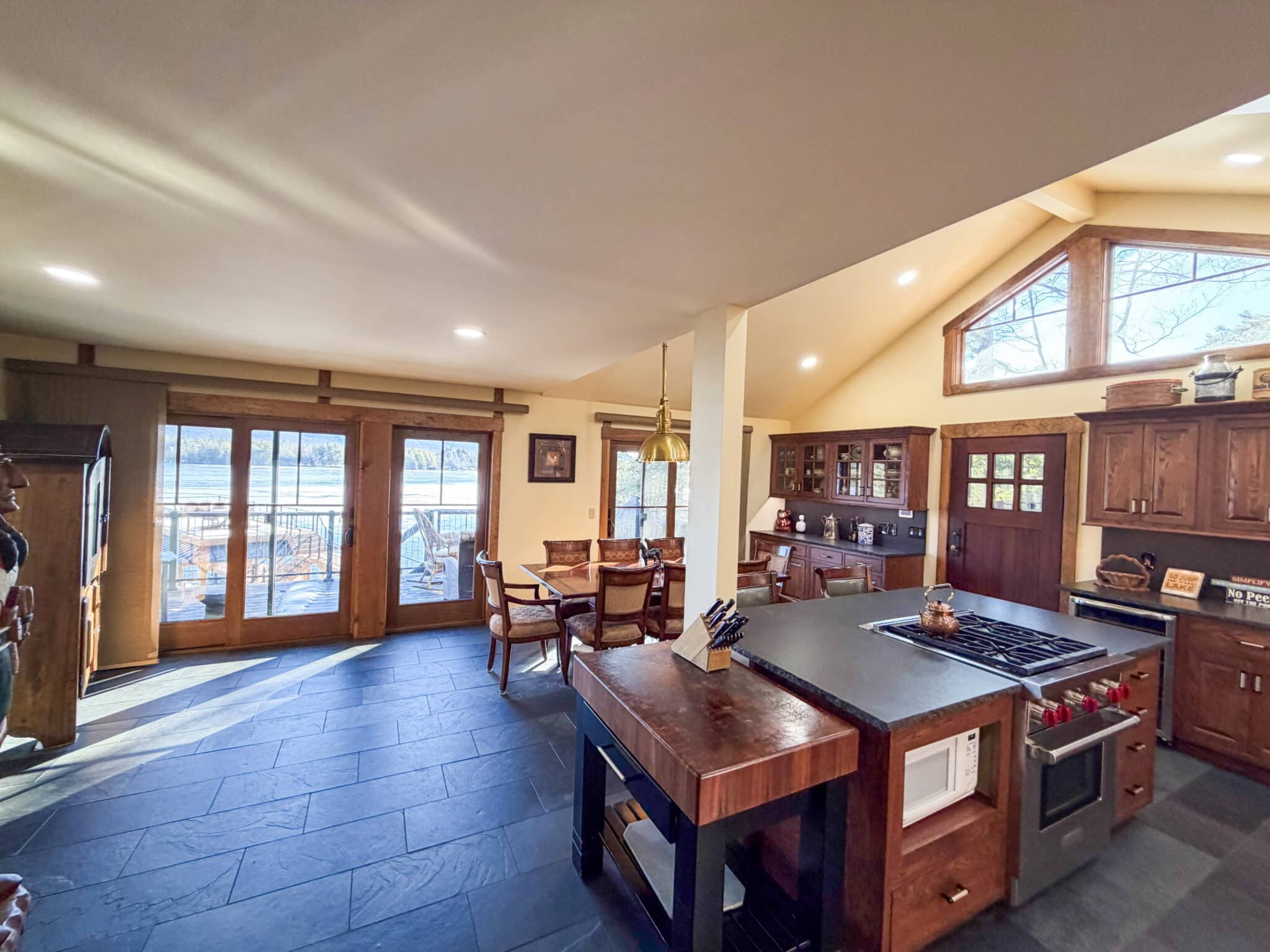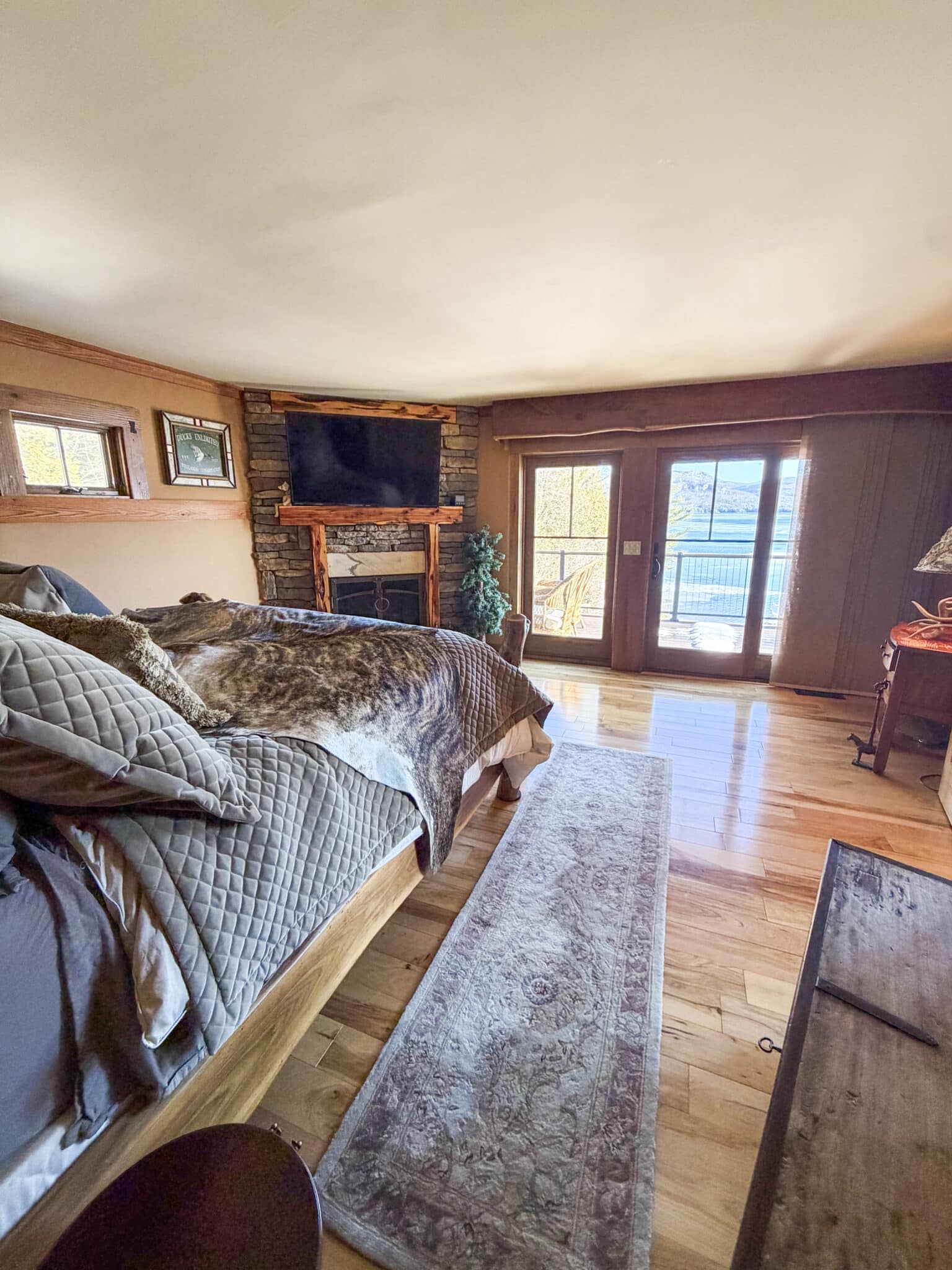 The property comfortably sleeps 14 guests, with a max of 16 guests. The main house features four bedrooms, a loft, and three full bathrooms. The master bedroom offers a luxurious king bed, a gas fireplace, and an ensuite bathroom. The three additional bedrooms each include queen beds, one on the main level and the other on the lake level. Each level also features a full bath. The lake level also offers a washer and dryer. The loft area provides extra sleeping and gathering space, making this home ideal for both relaxation and entertaining. At the heart of the home is a stunning open-concept kitchen, dining, and living area, thoughtfully designed for both entertaining and relaxation. Expansive windows frame picturesque, unobstructed views of Lake George, filling the space with natural light and creating a seamless connection to the outdoors. The gourmet kitchen flows effortlessly into the dining area and sophisticated living room, making it the perfect setting for memorable gatherings.