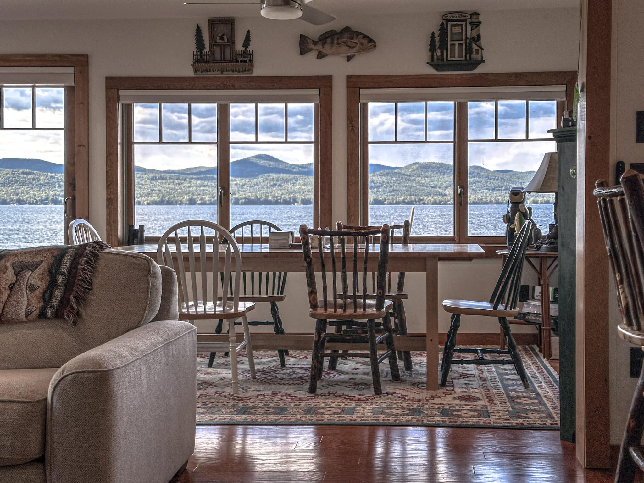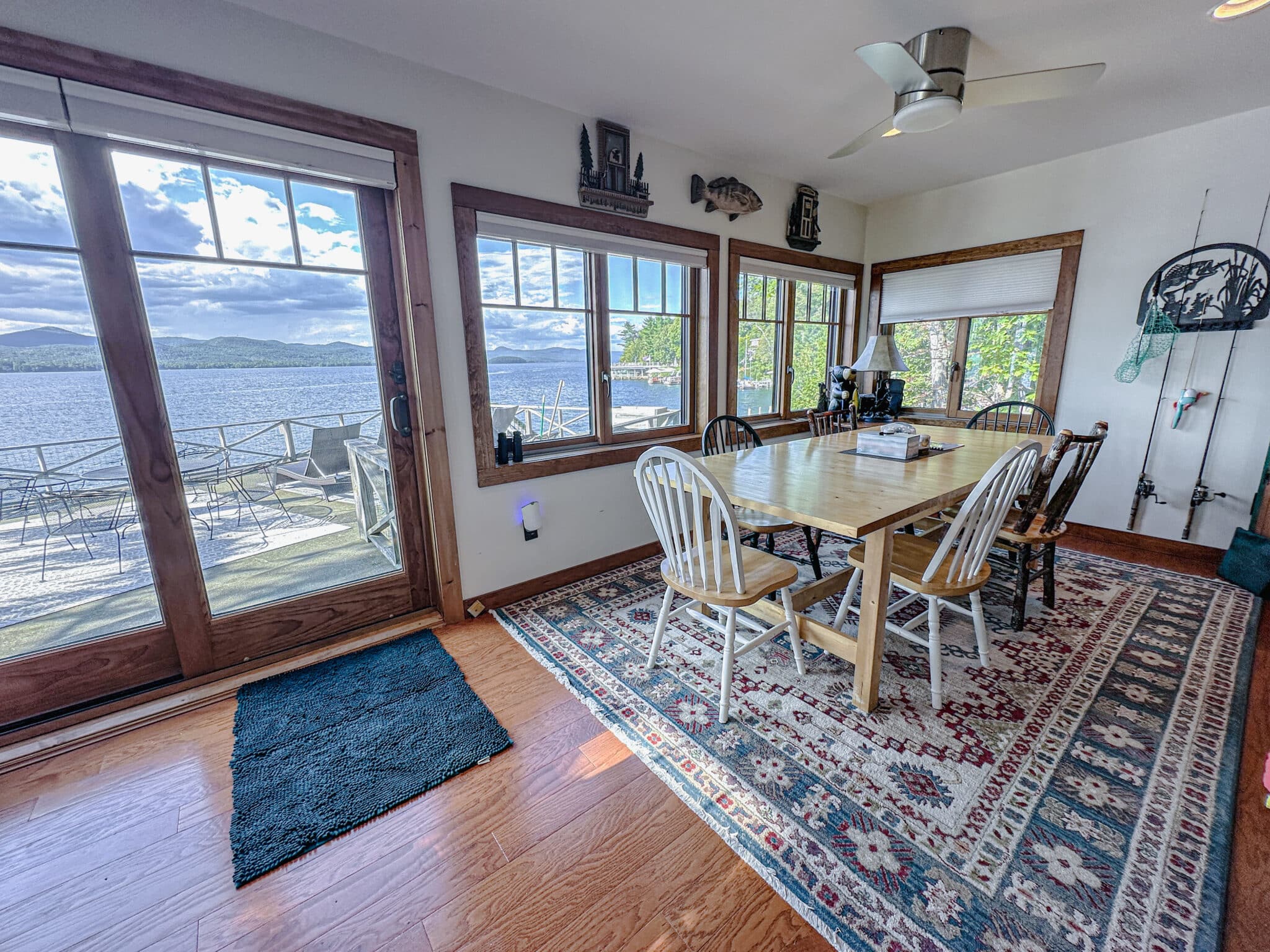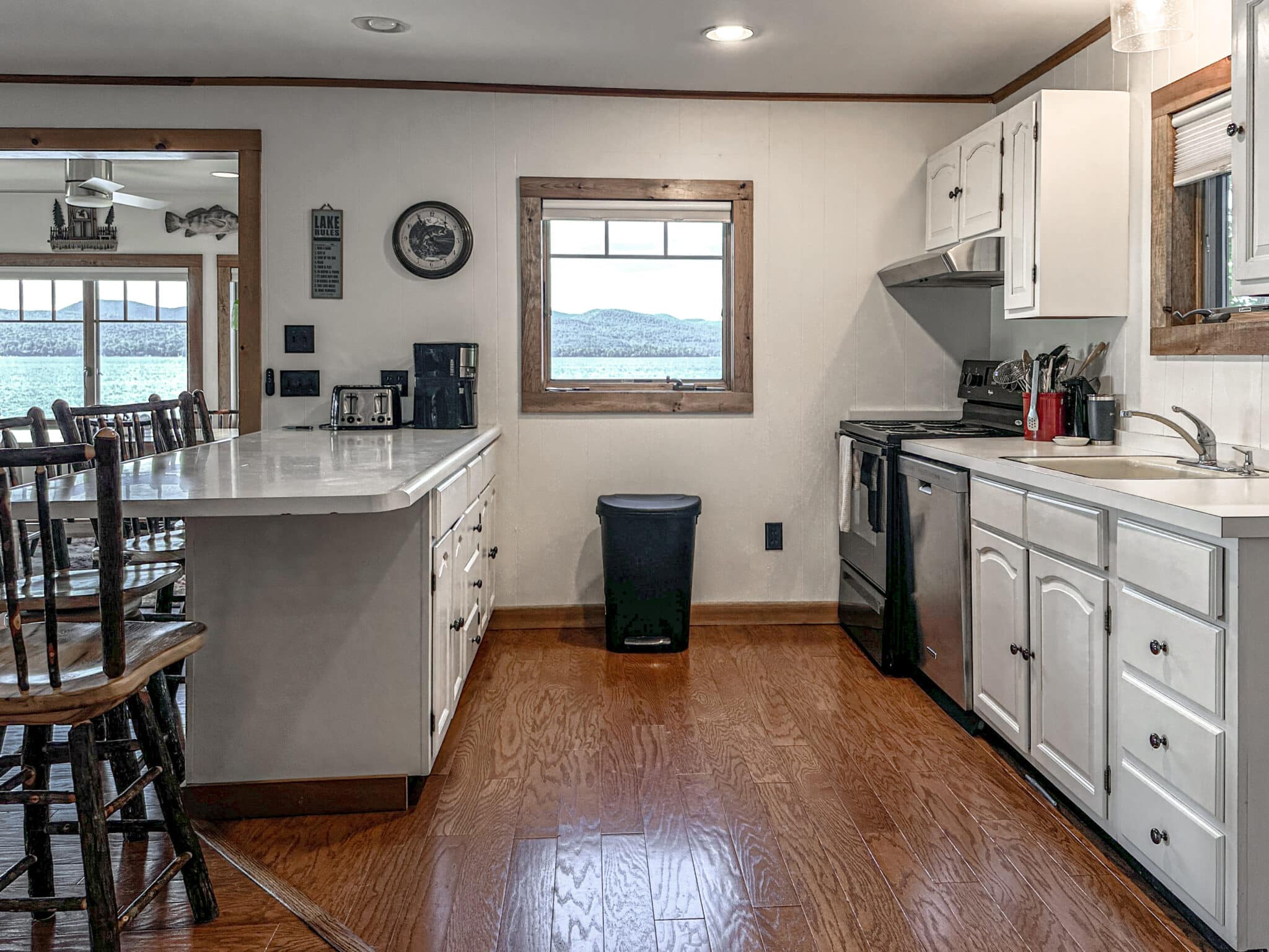 The fully equipped kitchen flows seamlessly into the dining room and inviting living room, creating an open, welcoming space to gather after a day on the water. Large windows frame stunning lake views, bringing the beauty of Kattskill Bay indoors.