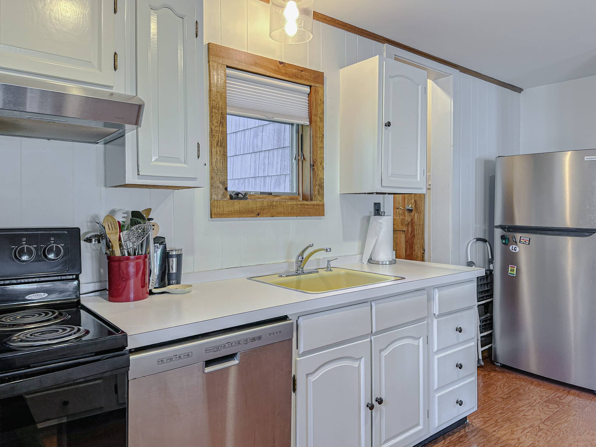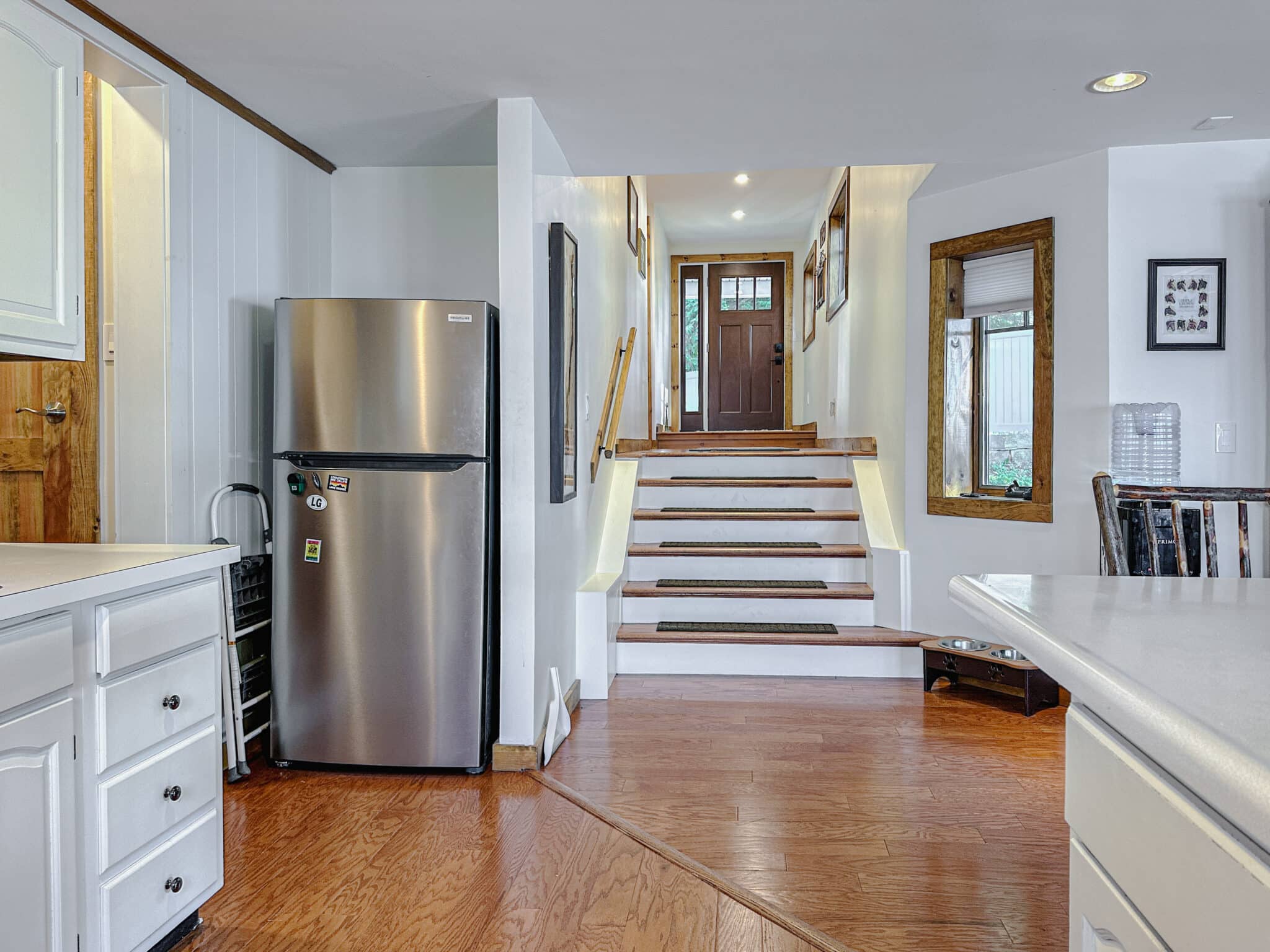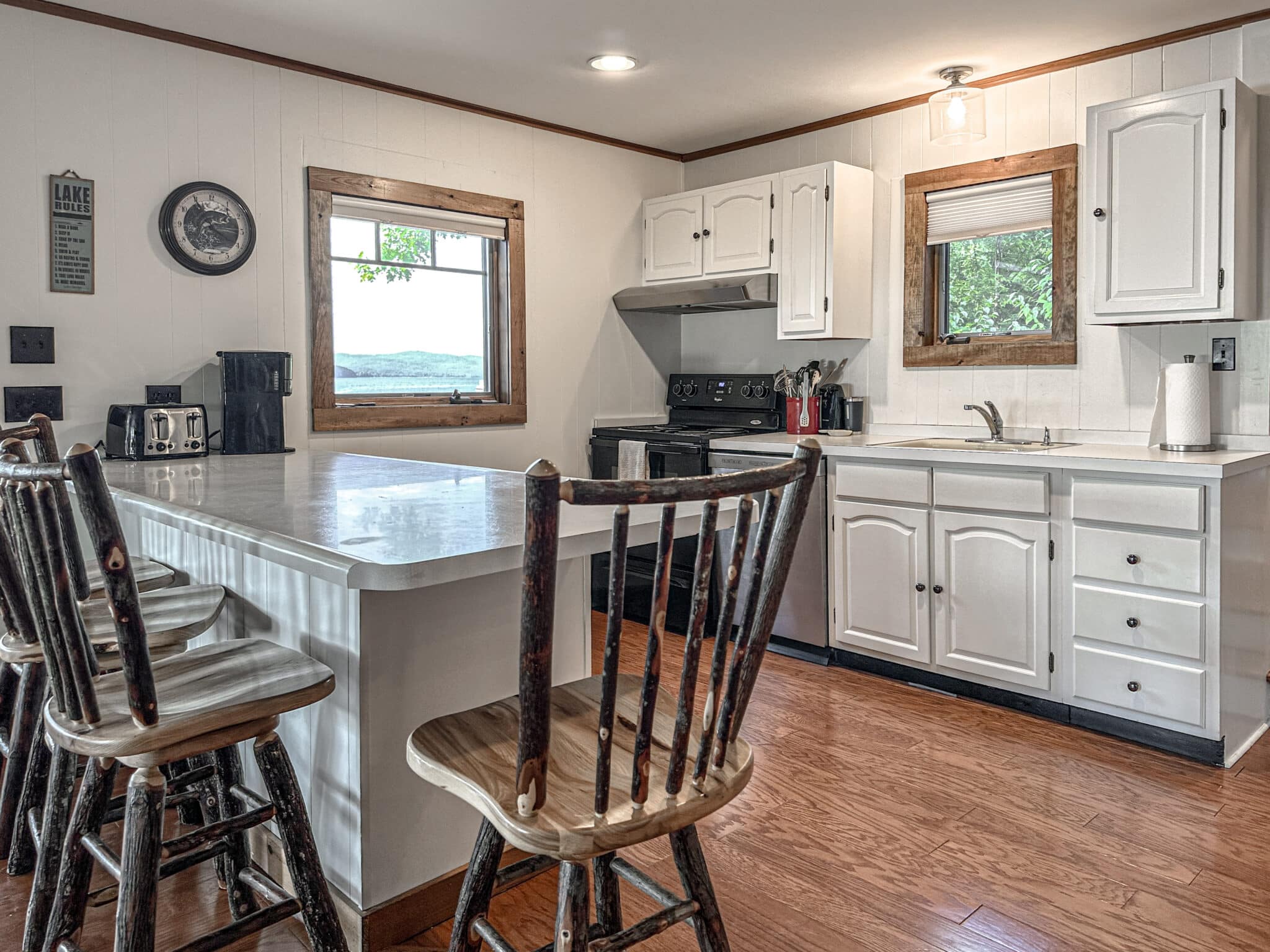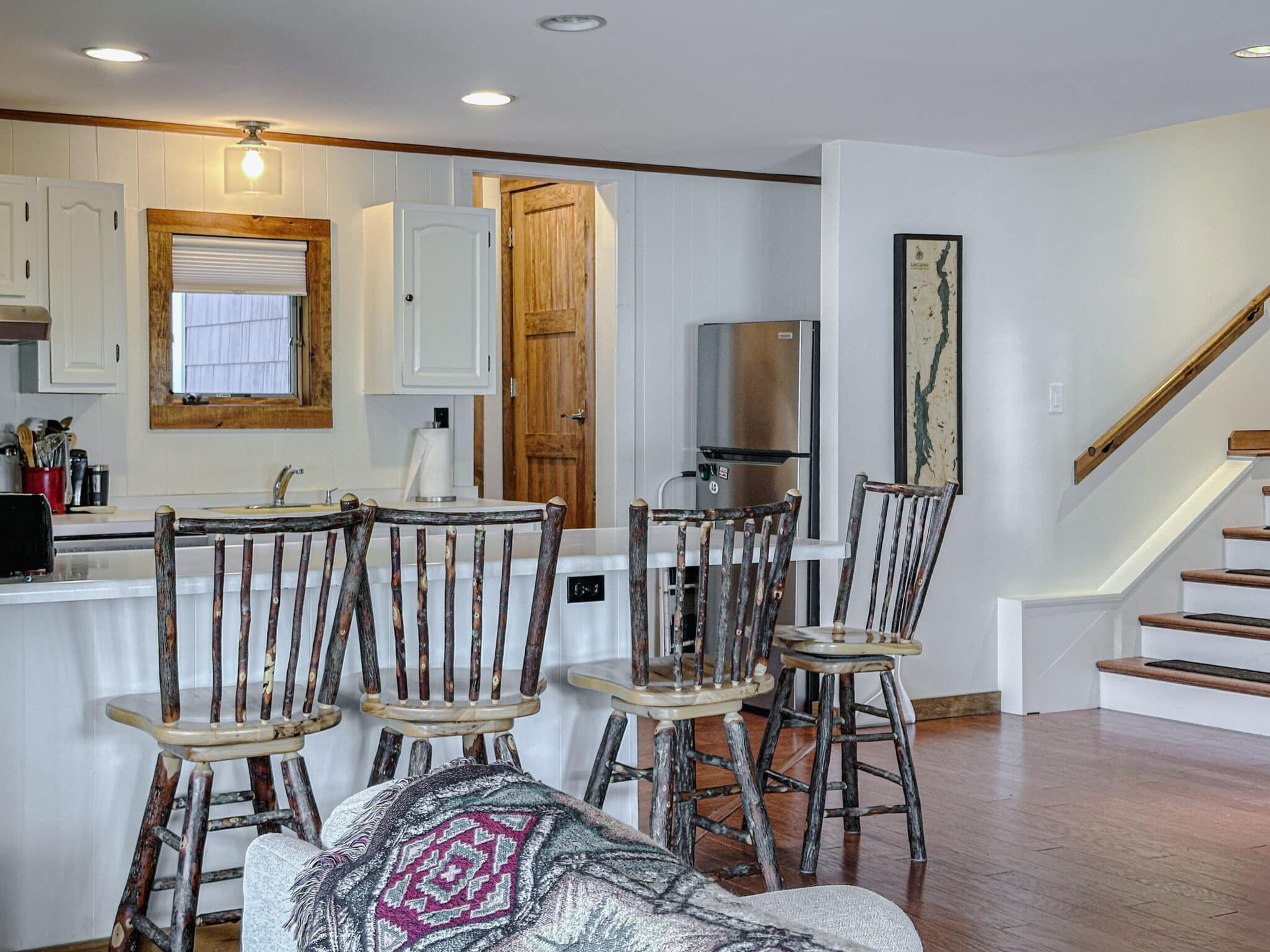 The fully equipped kitchen flows seamlessly into the dining room and inviting living room, creating an open, welcoming space to gather after a day on the water. Large windows frame stunning lake views, bringing the beauty of Kattskill Bay indoors.