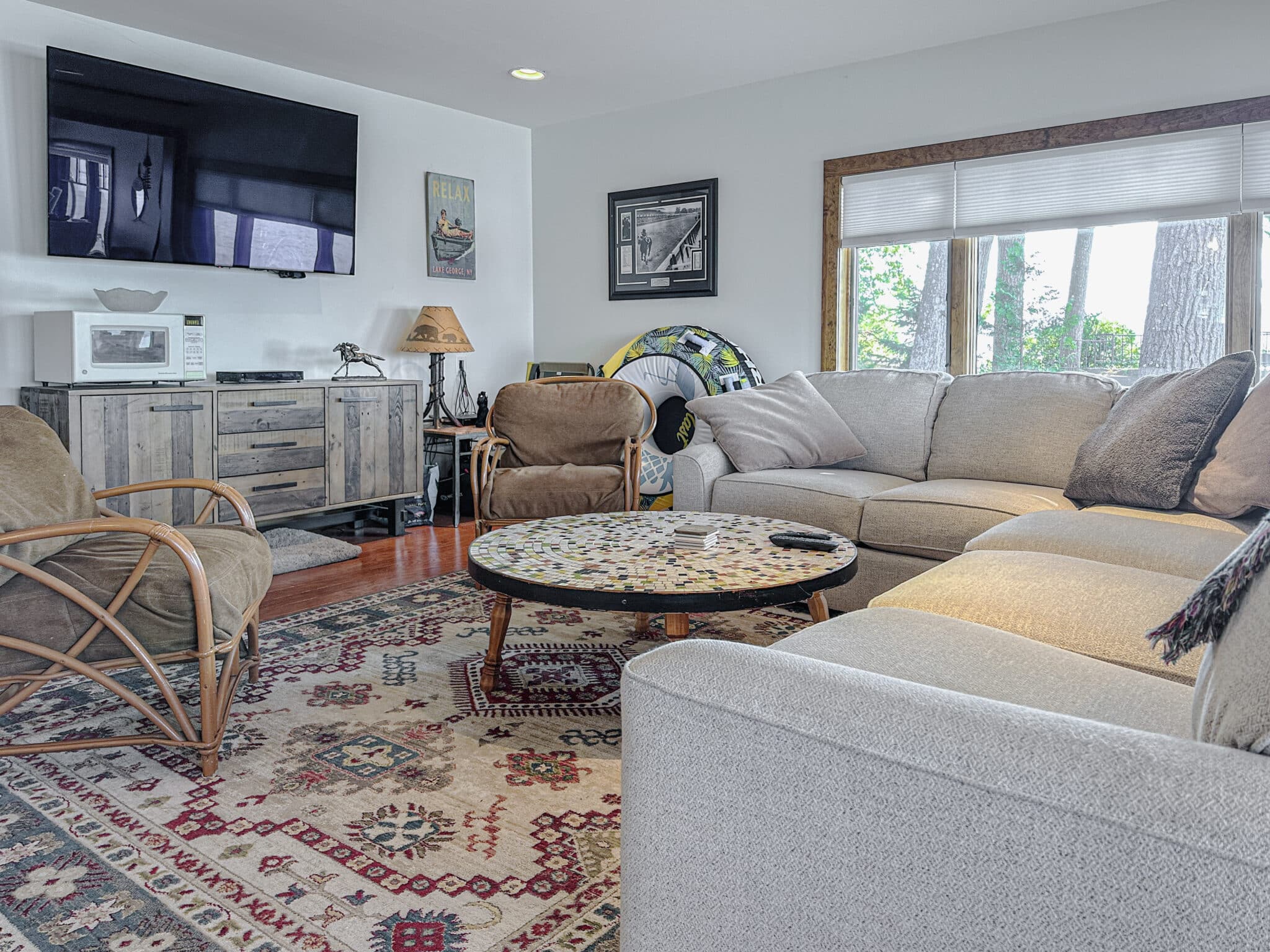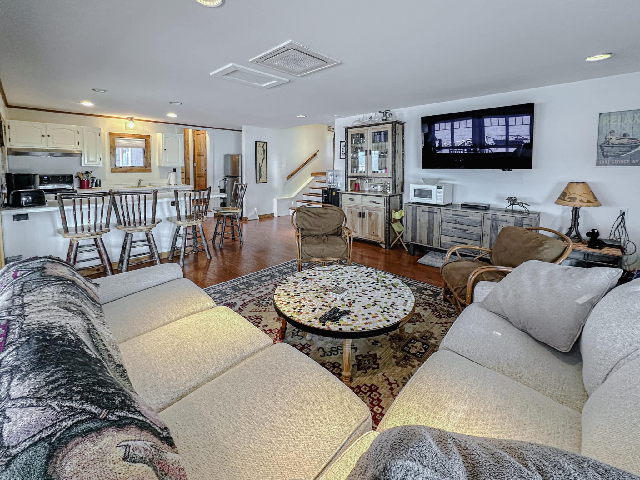 Outdoors, lake life takes center stage. Enjoy direct lake access, dock space for one boat up to 24 feet, and two kayaks ready for adventure. Evenings are best spent grilling lakeside, gathering around the fire pit, or unwinding on the sun deck atop the boathouse, where panoramic views of Lake George create unforgettable moments.