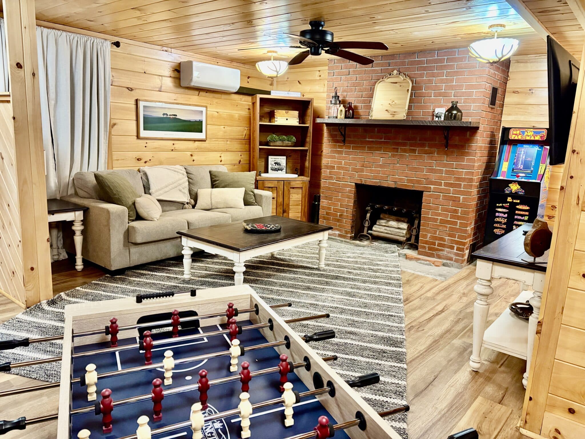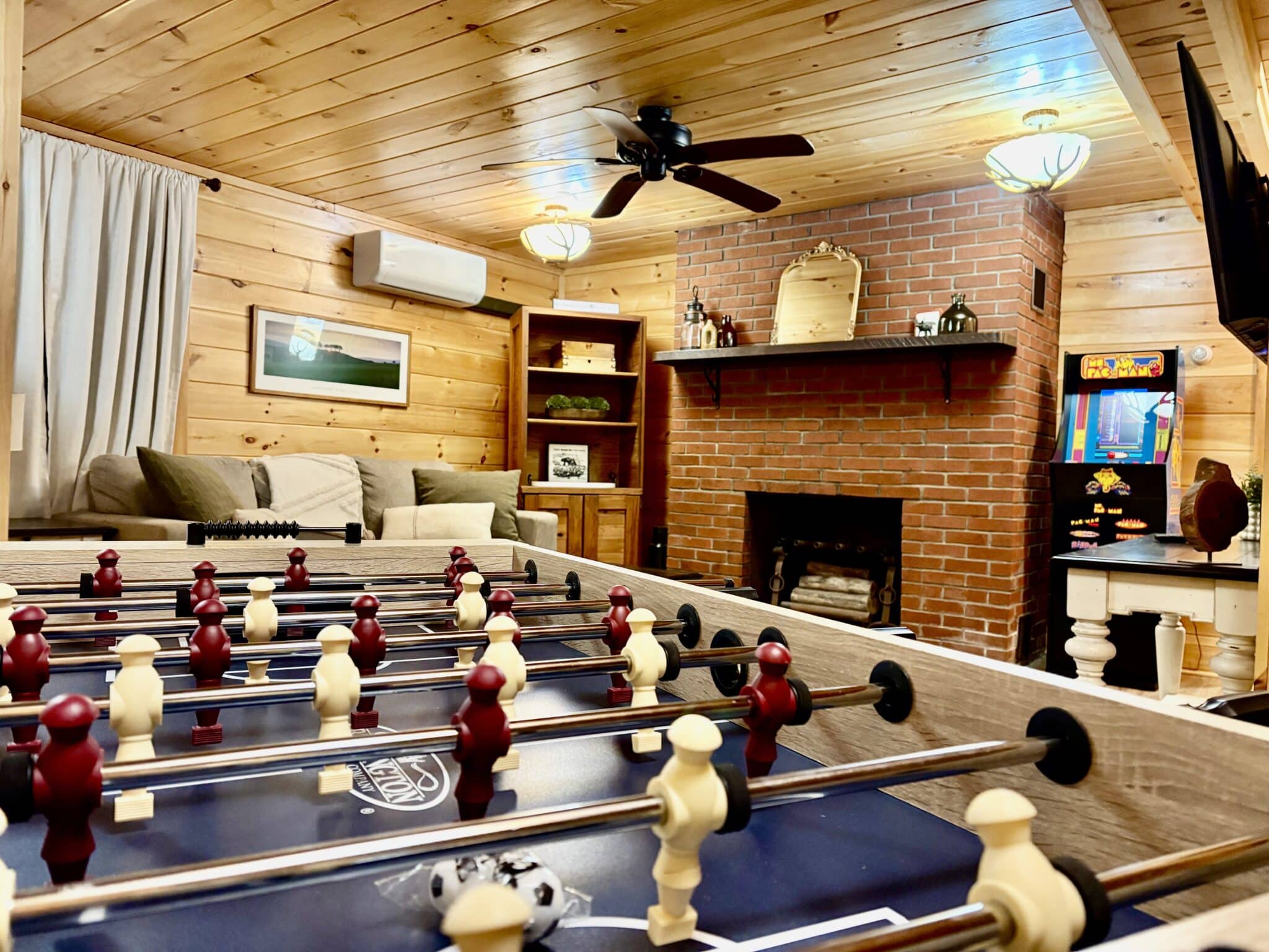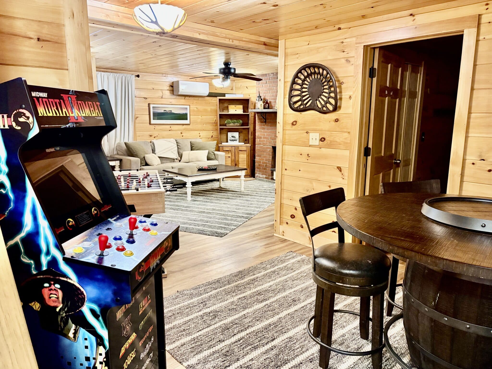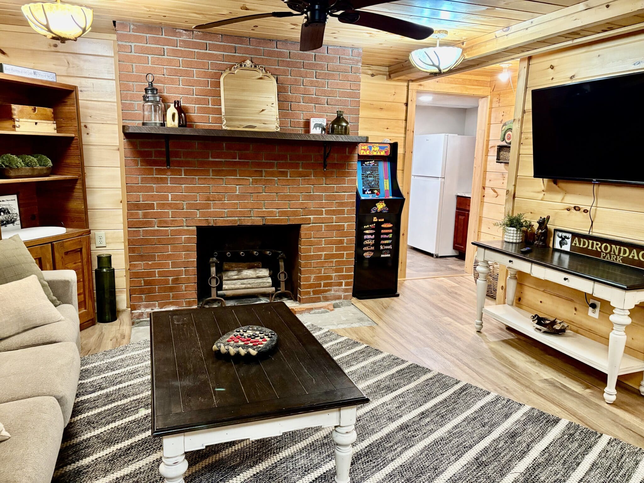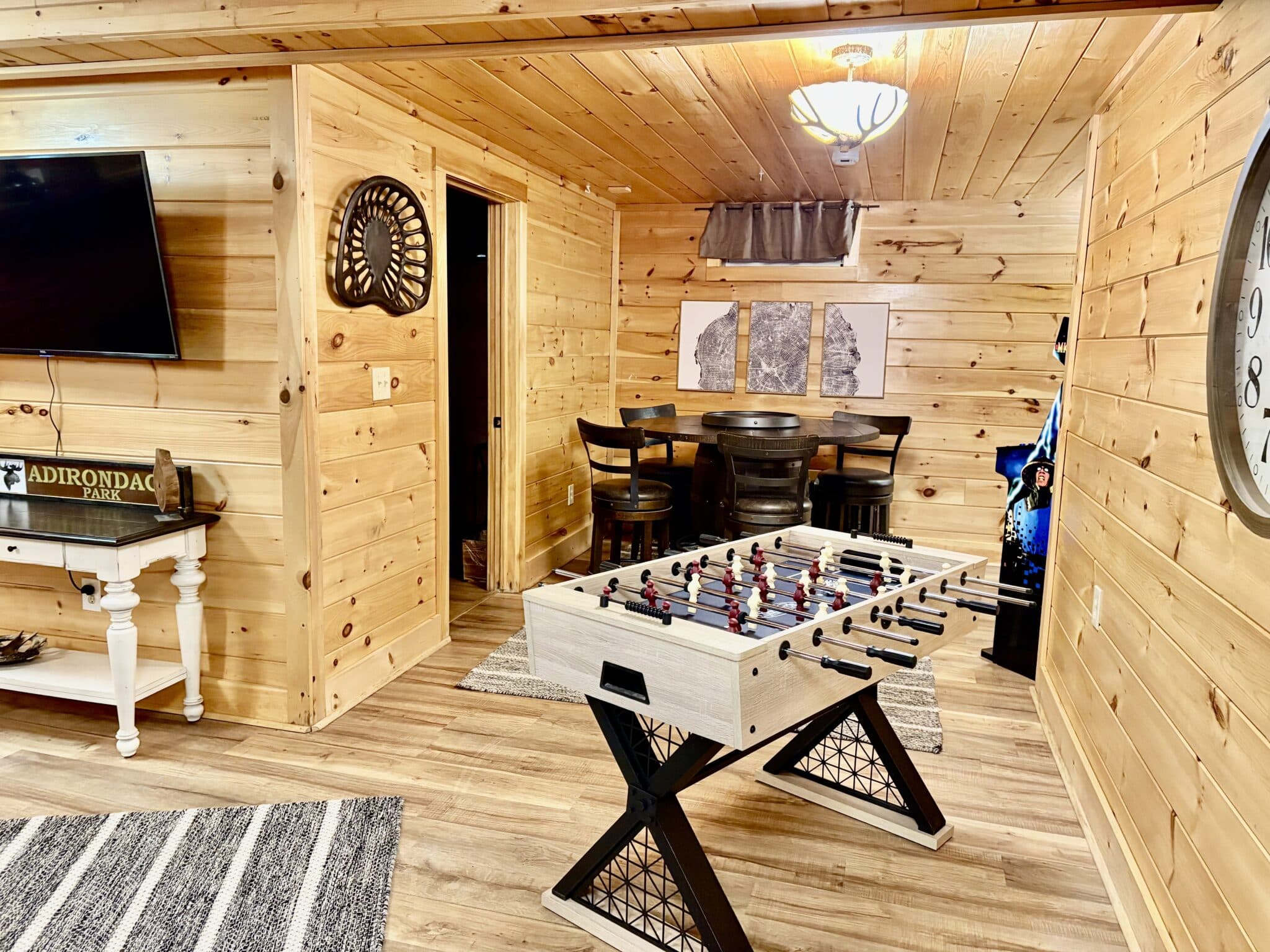 The cabin features an inviting atmosphere filled with natural wood accents, comfortable furnishings, and cozy touches that reflect the spirit of the Adirondack style. The living area in this Lake George cabin rental includes a large stone fireplace, perfect for gathering around on cooler evenings, and the shared heated pool is a standout amenity. The lower level features an additional kitchen, a second living room with a sleeper sofa, and a fourth bedroom with a queen bed. It also features a gameroom to the basement which includes 2 arcade games, a foosball table, and a dartboard.