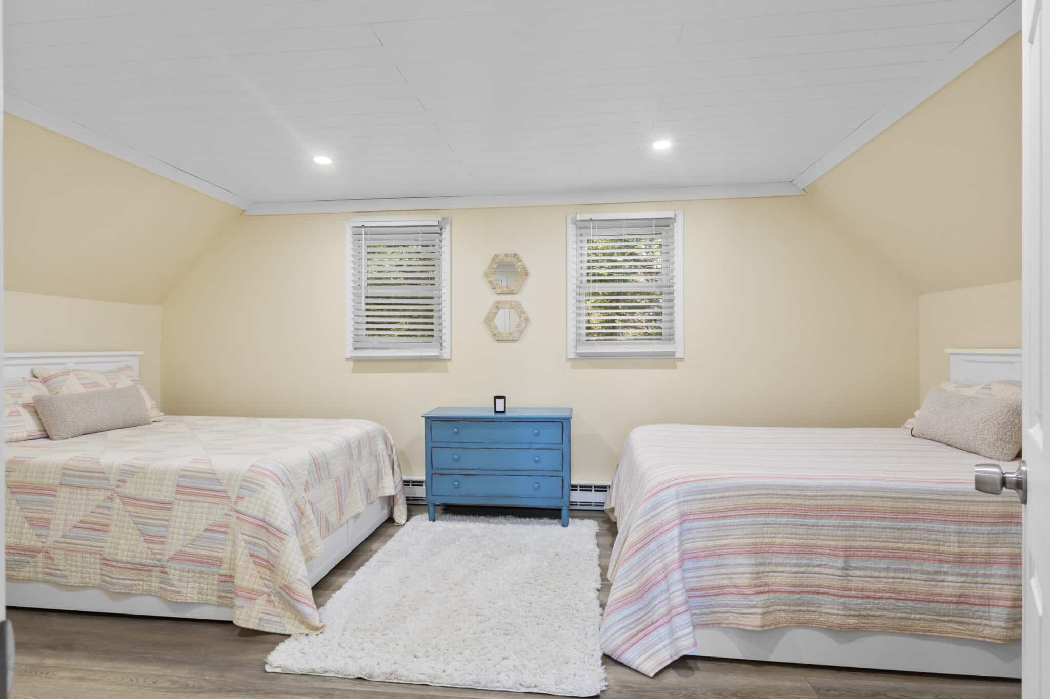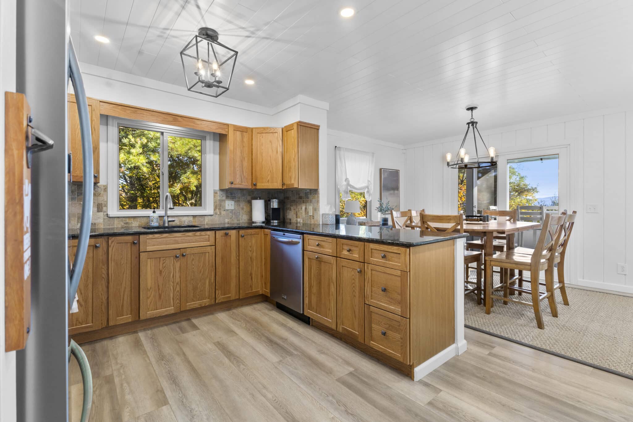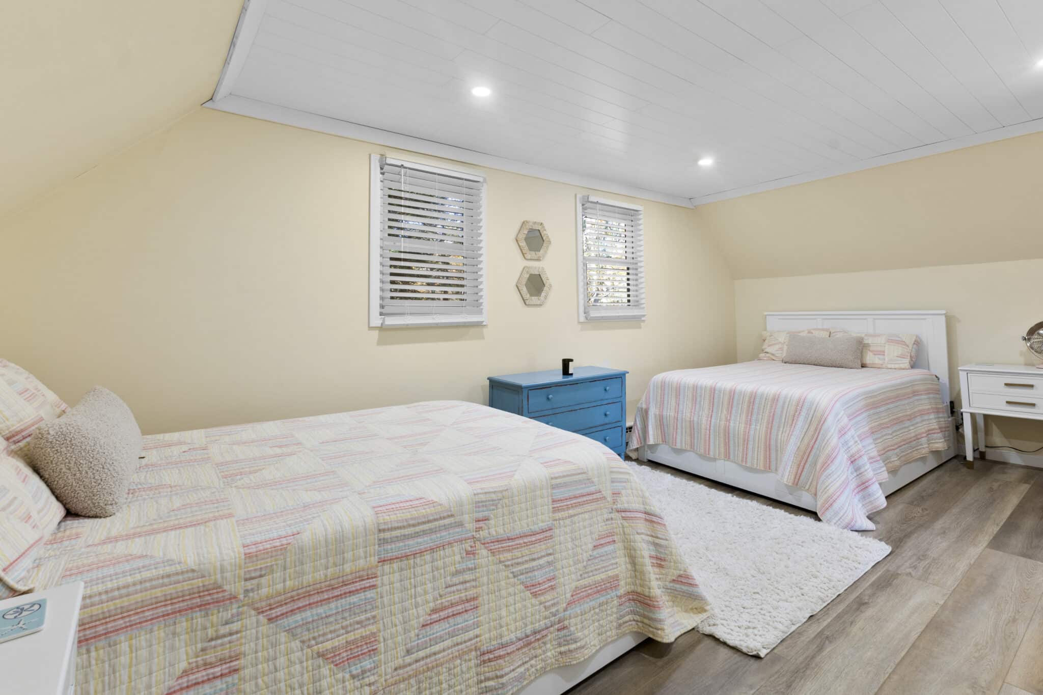 The home’s three bedrooms and three full bathrooms are thoughtfully designed to offer both privacy and flexibility for families and groups. The main-level master bedroom offers a king bed and a private full bathroom, while the upstairs bedrooms include two full-size beds with trundles in one room and a king bed in another. A full bathroom is also located upstairs for added convenience. The finished basement includes a family and game room, twin bunk beds with a trundle, and an additional full bath, providing the perfect space for family and friends.