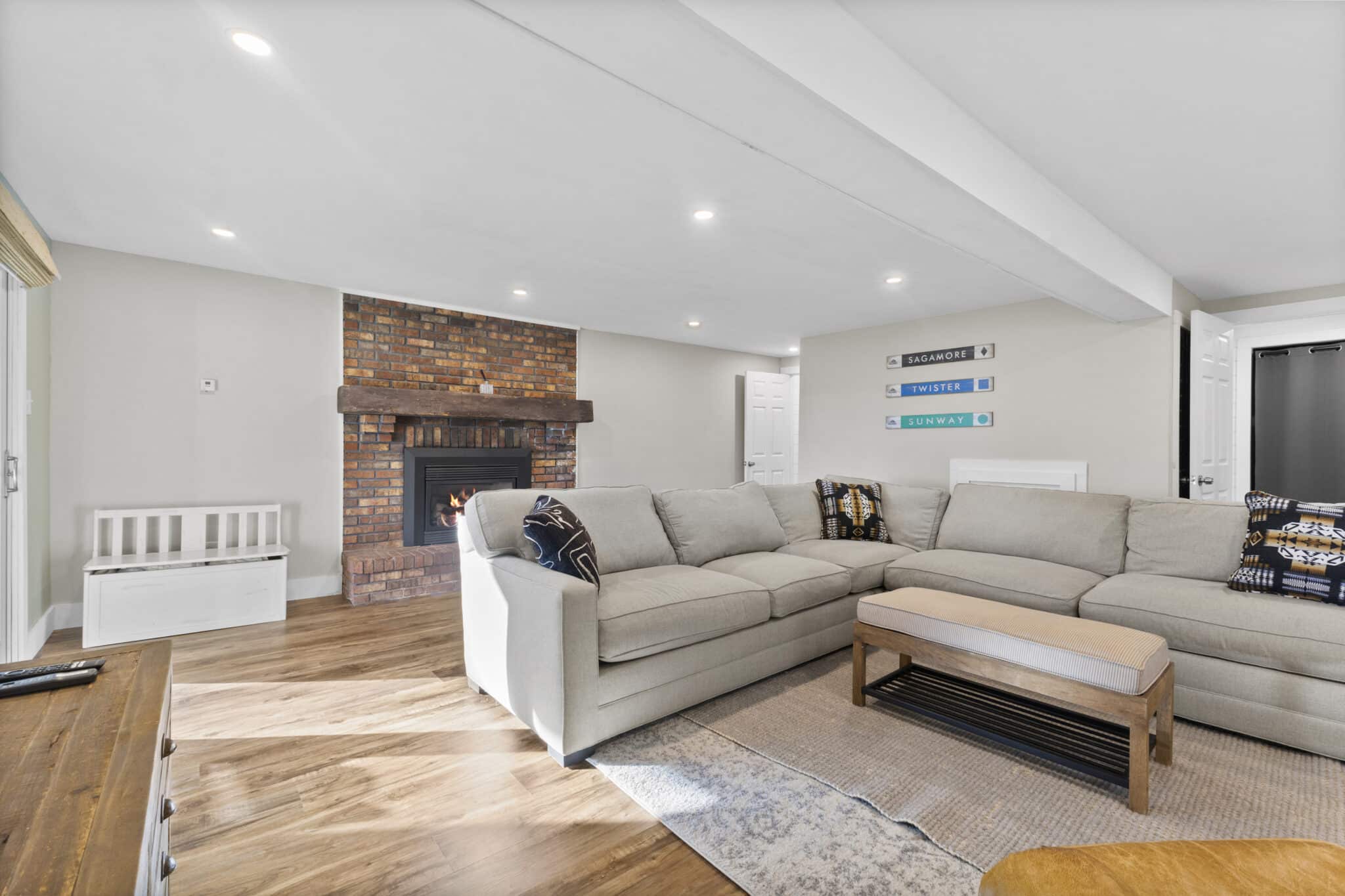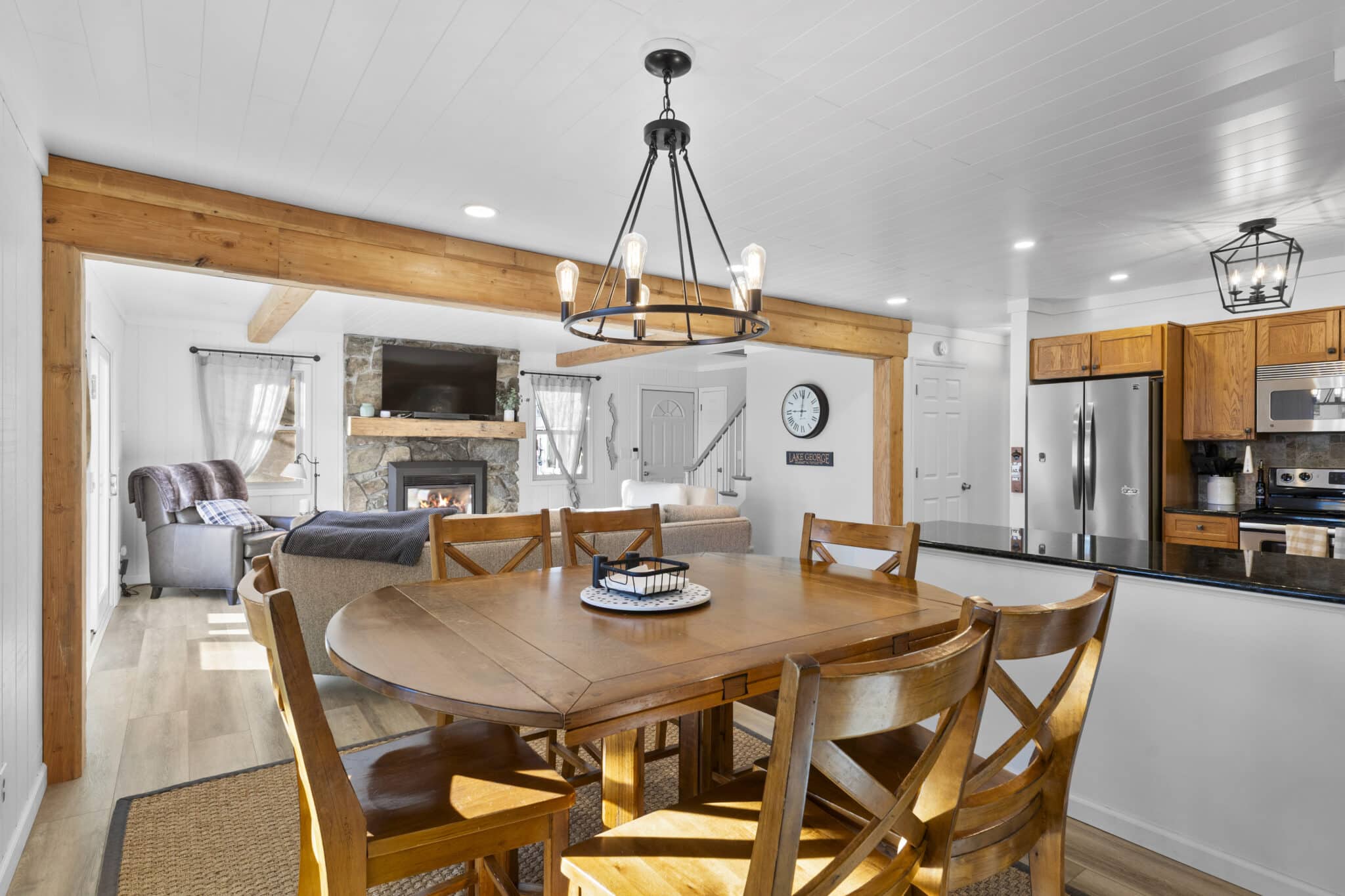 Inside, guests are greeted by a warm and inviting open-concept design that encourages connection and comfort. Whether you’re preparing a family meal or enjoying morning coffee with a view, the thoughtful layout ensures you always feel at home. The living room is centered around one of the home’s two stone fireplaces, each with propane inserts and thermostat control for effortless warmth and ambiance. From the living area, sliding glass doors open onto a spacious deck, perfect for taking in the filtered views of Lake George and the surrounding mountain landscape.