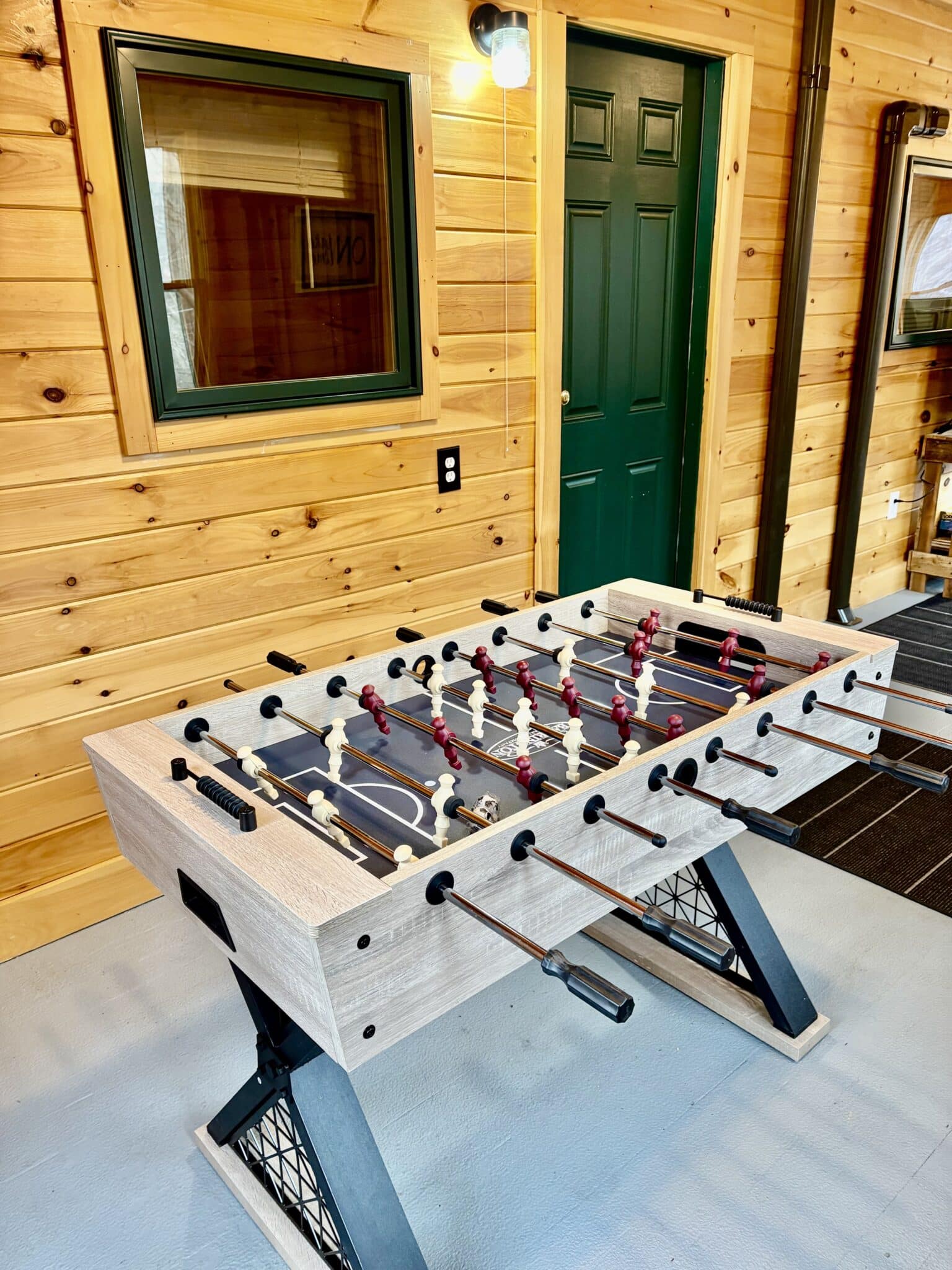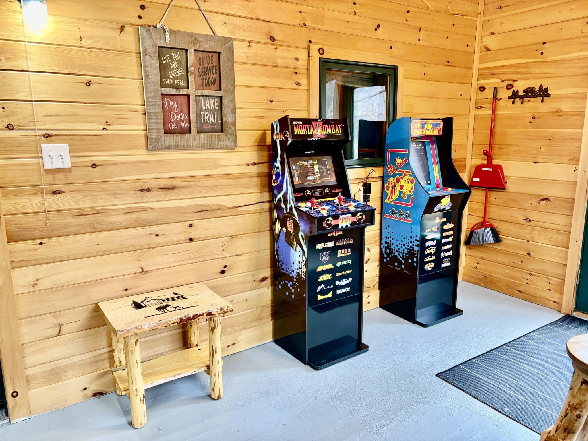 The main area includes a full kitchen with a dining table, making it easy to prepare meals or snacks during your stay. Step outside to enjoy the patio area, outdoor picnic table, charcoal grill, shared heated pool, and fire pit, perfect for relaxing or gathering under the stars. The porch also includes 2 arcade games and a foosball table.